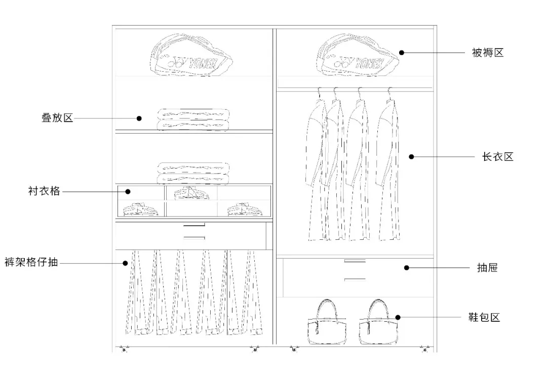 悬挂区要考虑到常用衣物的尺寸,长衣区够长,衣服尾端就不会被折起来。叠放区也不宜太高,不然不方便取放。