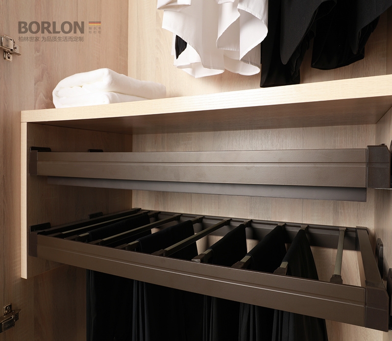 不常用的毛衣可放在较深的抽屉里,长裤则可设计专用的“裤架”存放。