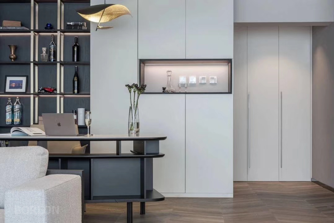 客厅的左侧巧妙运用过道空间打造了一个工作区,一门到顶的白色柜子与开放式展示柜的组合,实用与美观兼备。
