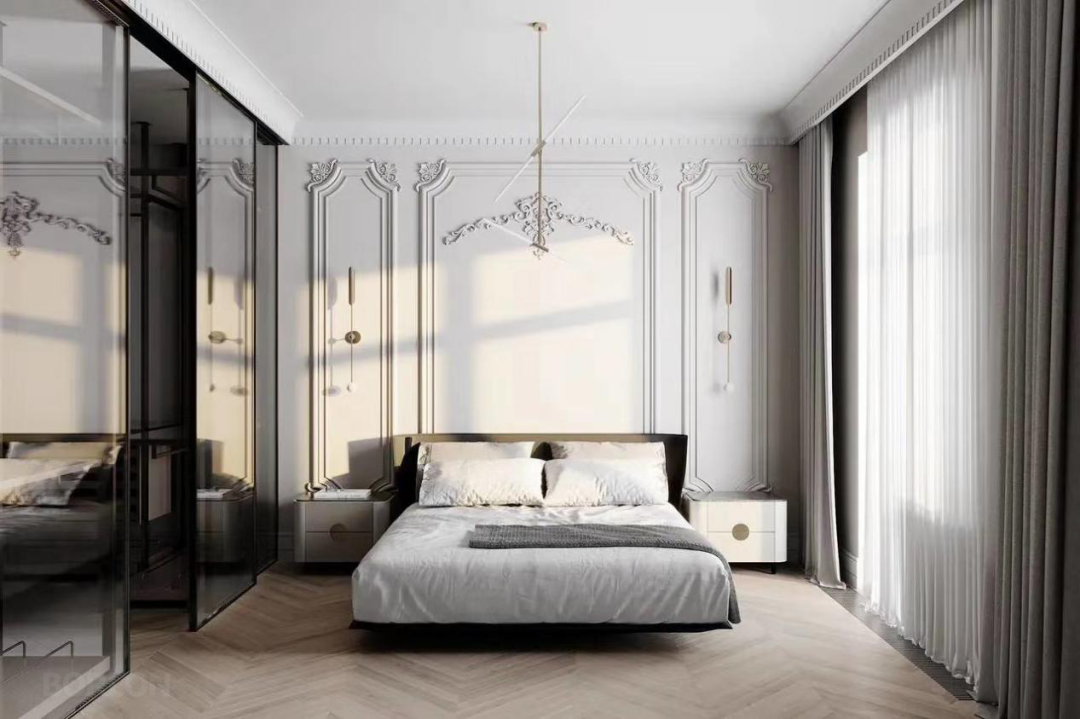 以简约的自然本质,打造极简的生活空间,主卧中,配色简单大方,通透明亮。白色的背景墙与铜色金属灯饰搭配相得益彰,简洁之中透露着沉稳。灯具线条利落,极简之中又带着一丝轻奢感。