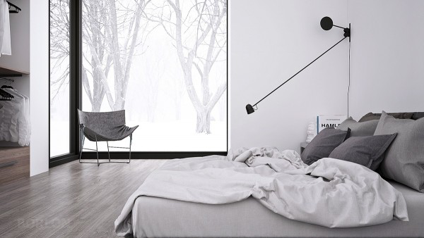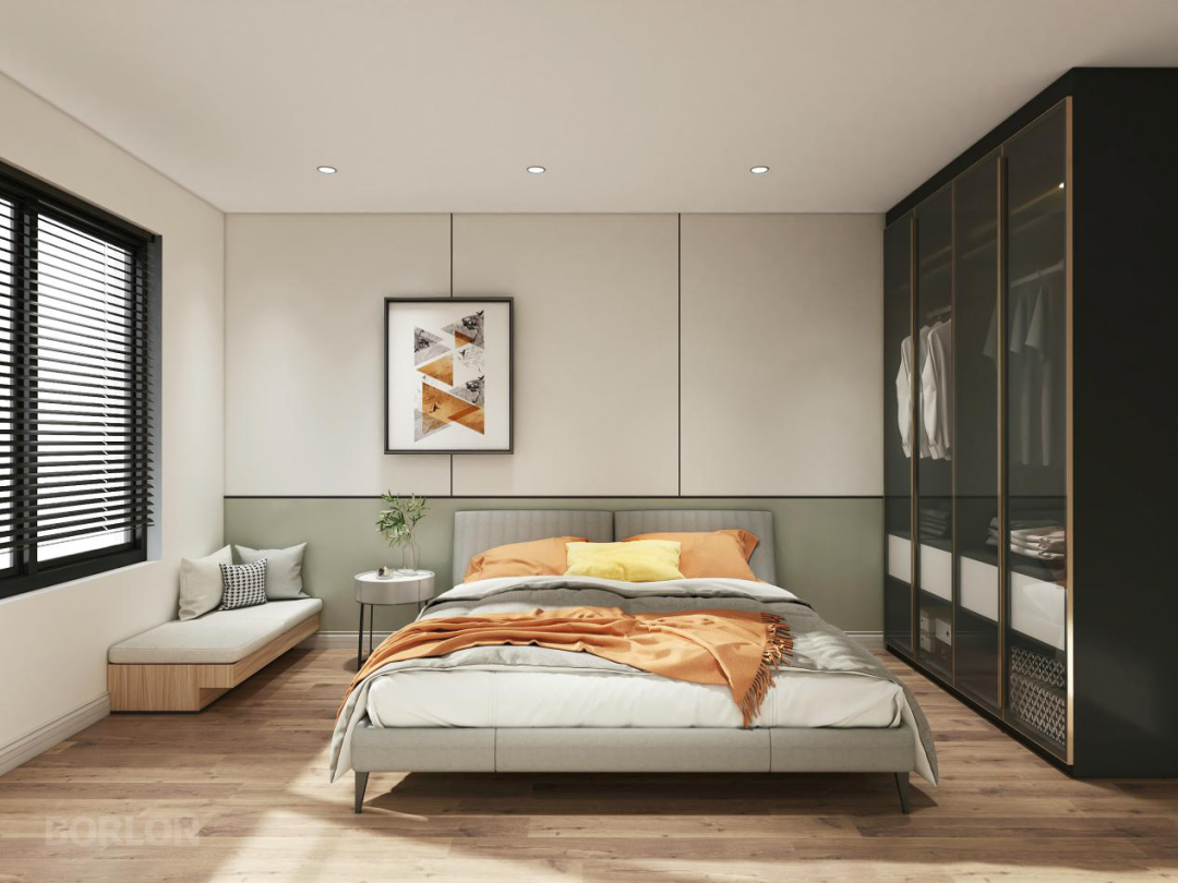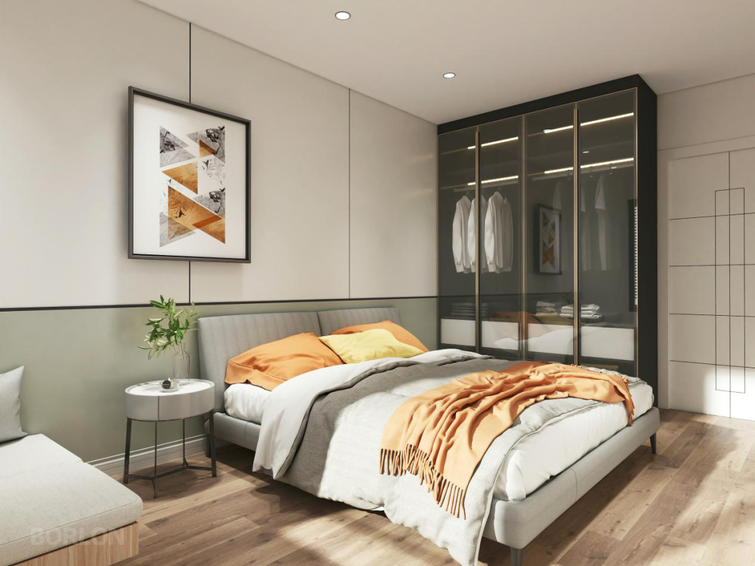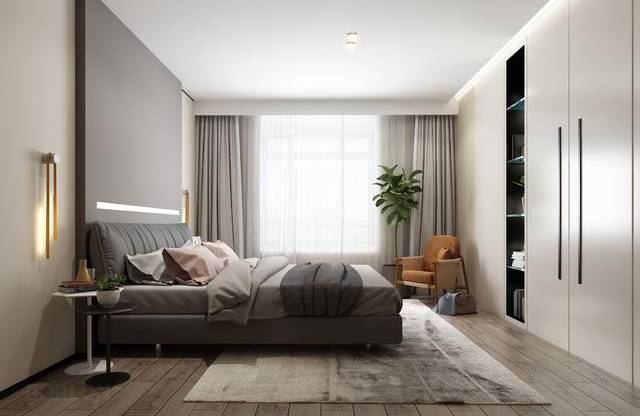 与主卧相比,次卧在色彩上增添了一份活力,浅灰色的床单,暖橙色的枕套,原木纹的地板,简洁之中透露着温暖的气息,再搭配上斯蒂芬尼墨黑玻璃门衣柜,使得空间更加简单而又不失个性,把少而精的极简主义发挥的非常彻底。