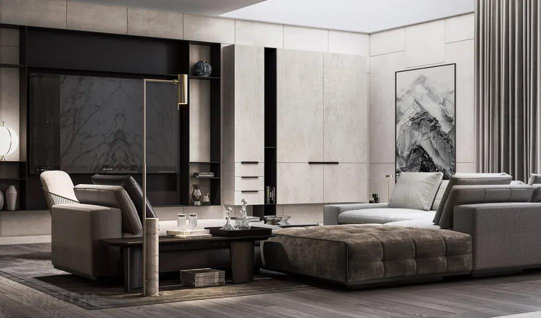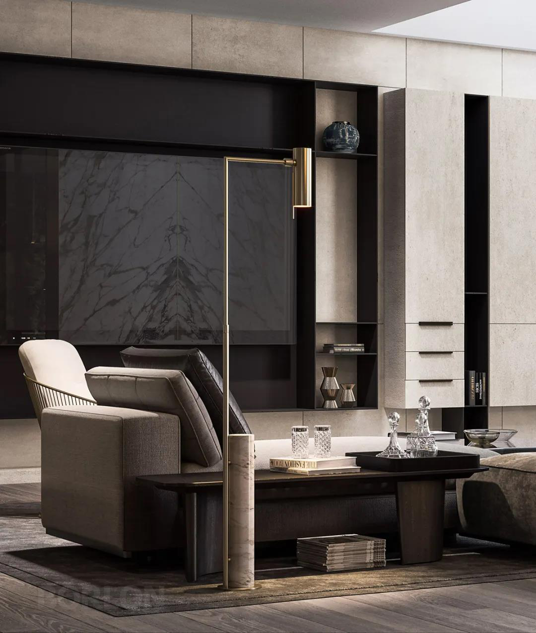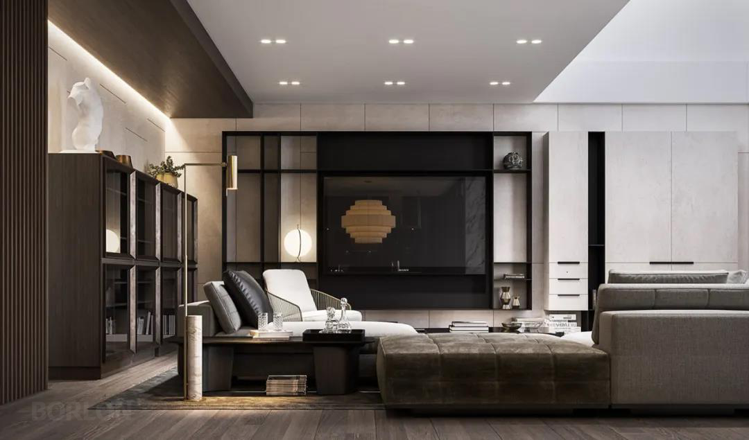 黑色的电视背景墙搭配勃兰幻影雪岩储物柜,深浅交织,营造了视觉上的层次感。精致的硬装赋予空间低调奢华的气质,由浅入深的色调变换打造出层次鲜明的视觉感,整个空间将储物与装饰的比例把握的恰到好处,精致的摆件,更添了几分雅趣。