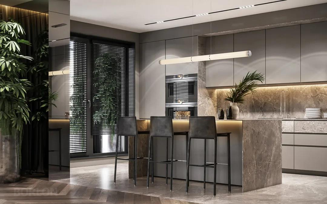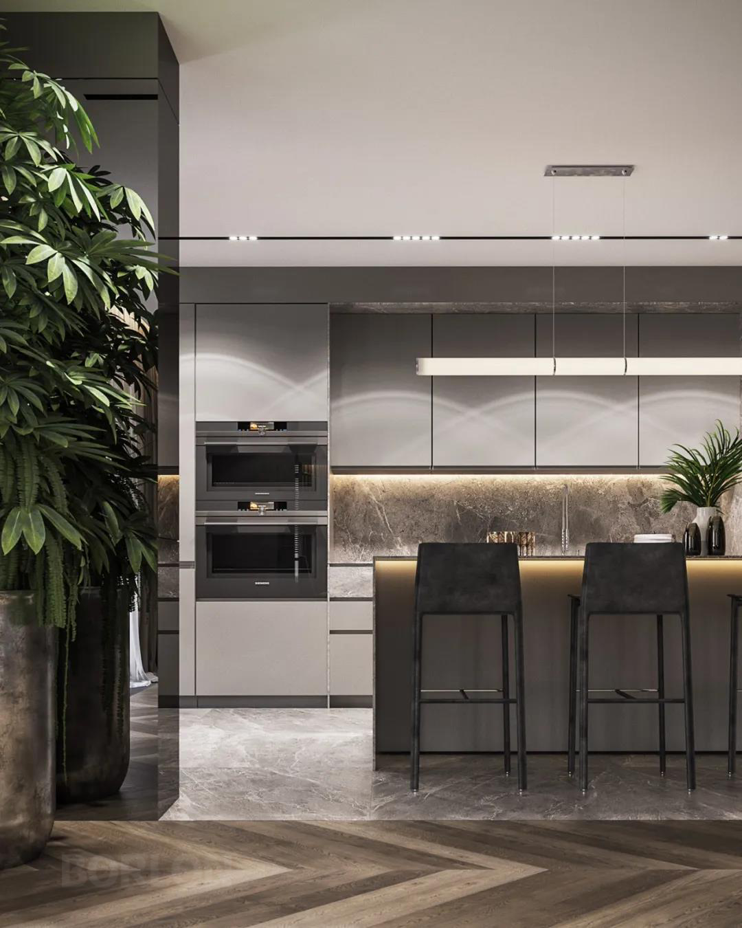开放式的厨房现代感十足,斯蒂芬尼白银灰橱柜,立面干净通透,搭配勃兰登堡灰理岩中岛,在灯光的映衬之下,更显时尚与精致,每一个角落,都散发着优雅知性的迷人气质。