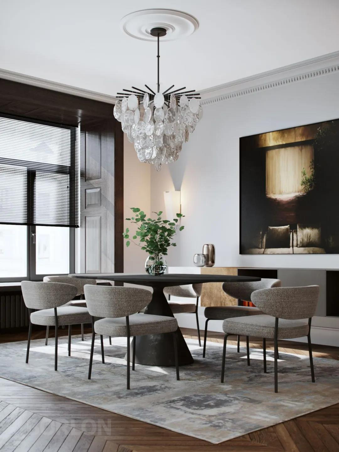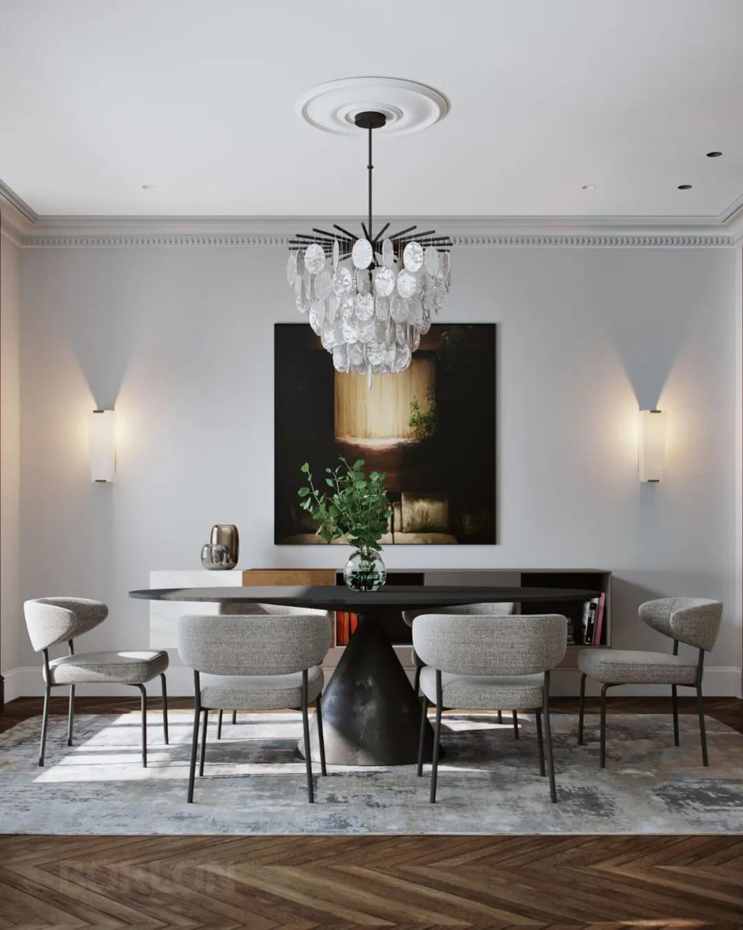 餐厅没有太多的装饰,简单的勃兰幻影雪岩餐边柜、造型别致的吊灯、桌面的小绿植、一幅壁画,让生活的质感油然而生,弥漫在空中的是生活的温暖与美好和谐的用餐氛围。