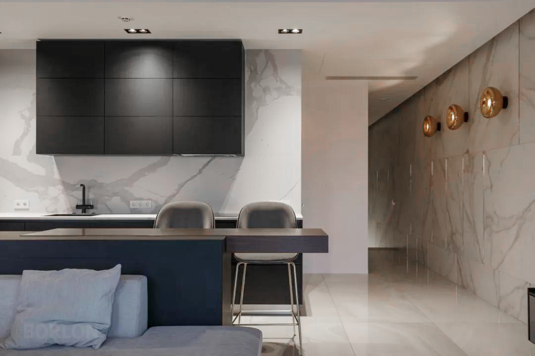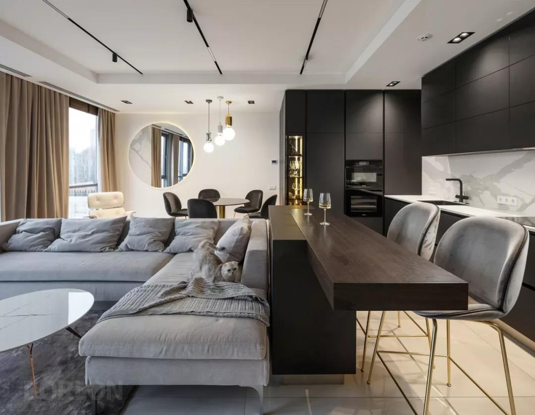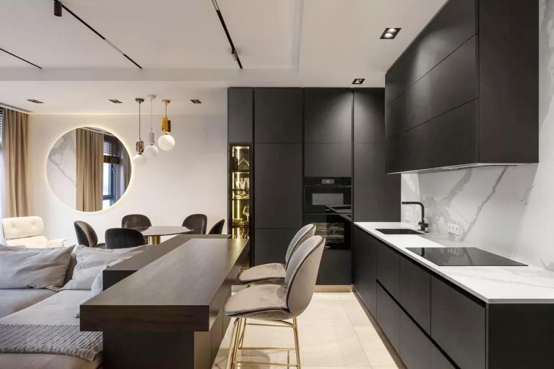 厨房与客厅相连,运用适量的线条,简约的吊灯来作为点缀,整个空间呈现出一种精炼、简洁之感。斯蒂芬尼静墨灰橱柜时尚大气,站在厨房里准备几份精致的菜肴,满足的不只是饥饿的身体,还有疲惫的灵魂。