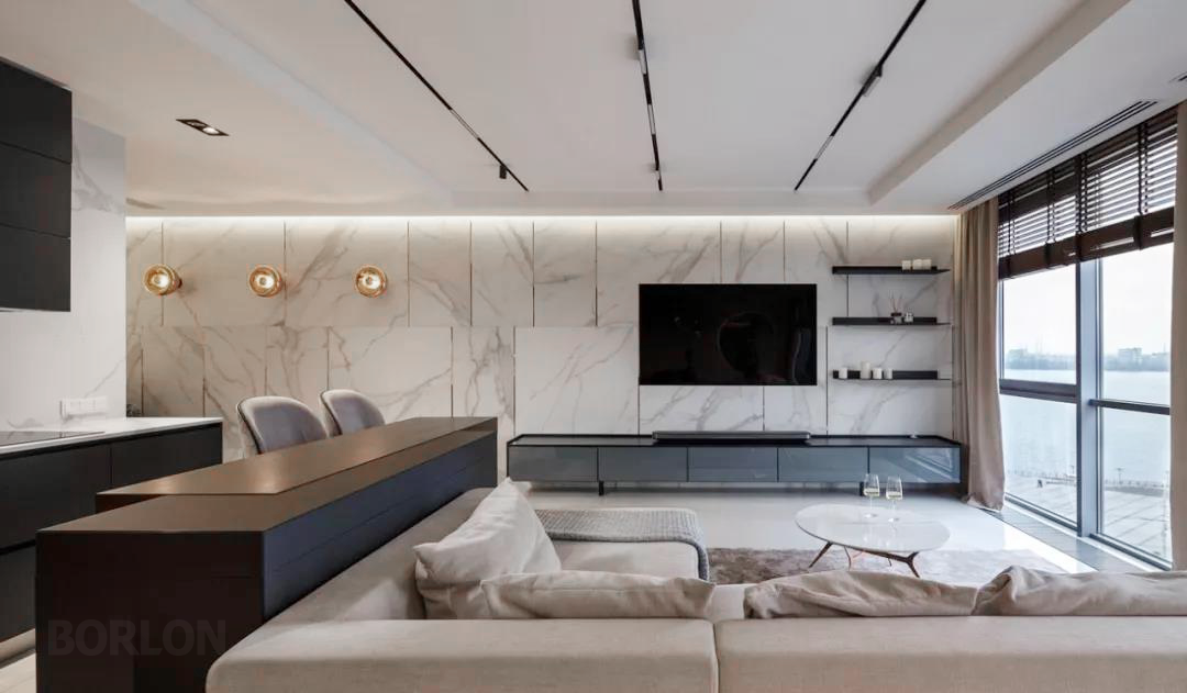 摒弃一切繁杂的摆设客厅空间,用最简洁舒适的设计勾勒出生活的质感,大理石电视背景墙纹理清透自然,斯图加特极品哑光灰电视柜精巧雅致,二者搭配相得益彰,让整个室内的空间散发出安稳的气息。