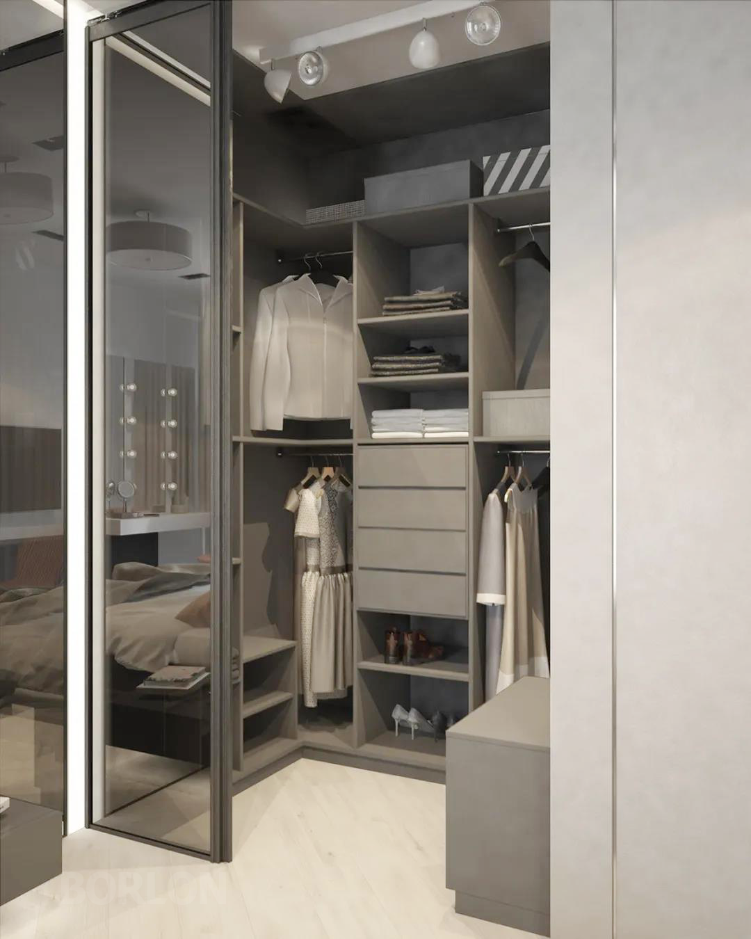 卧室的空间以极其细腻优雅的简洁线条,不失质感的设计给人带来高贵宁静的视觉感受,玻璃门衣柜干净的线条、纹理和色调是构成整个宁静空间的主旋律,带着时尚的精英气质,呈现出主人不凡的品味与内涵。