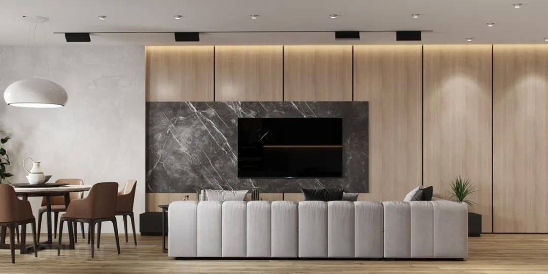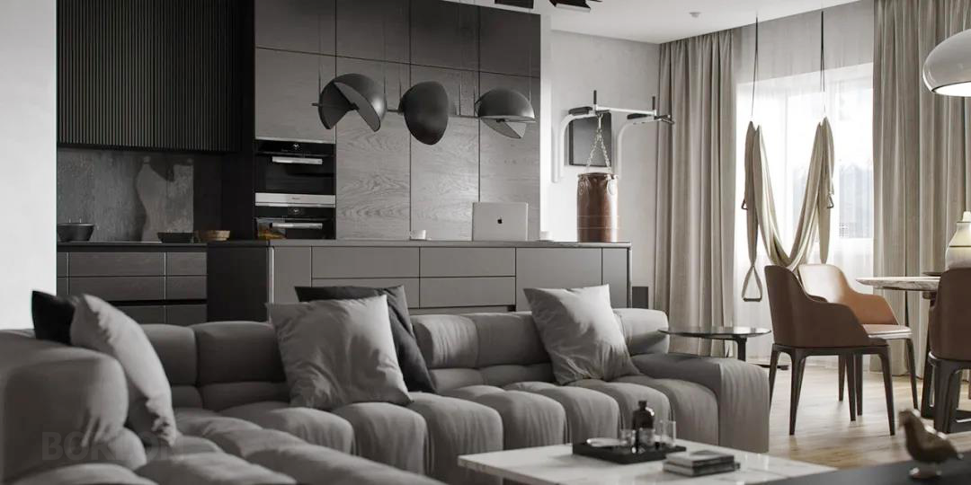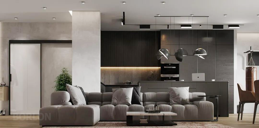 空间的灵活性也展现了生活的舒适度,客厅、厨房、餐厅一体化的设计,形成了一个温暖且舒适的交流互动空间,给人冷静安谧的视觉享受,
