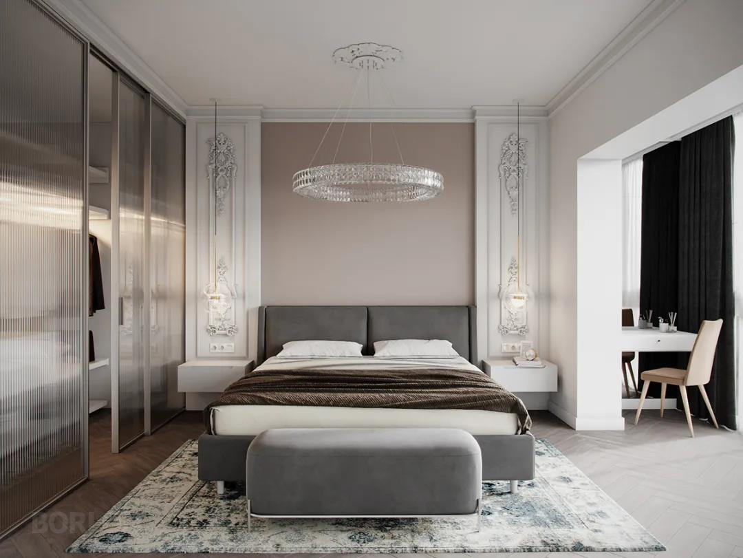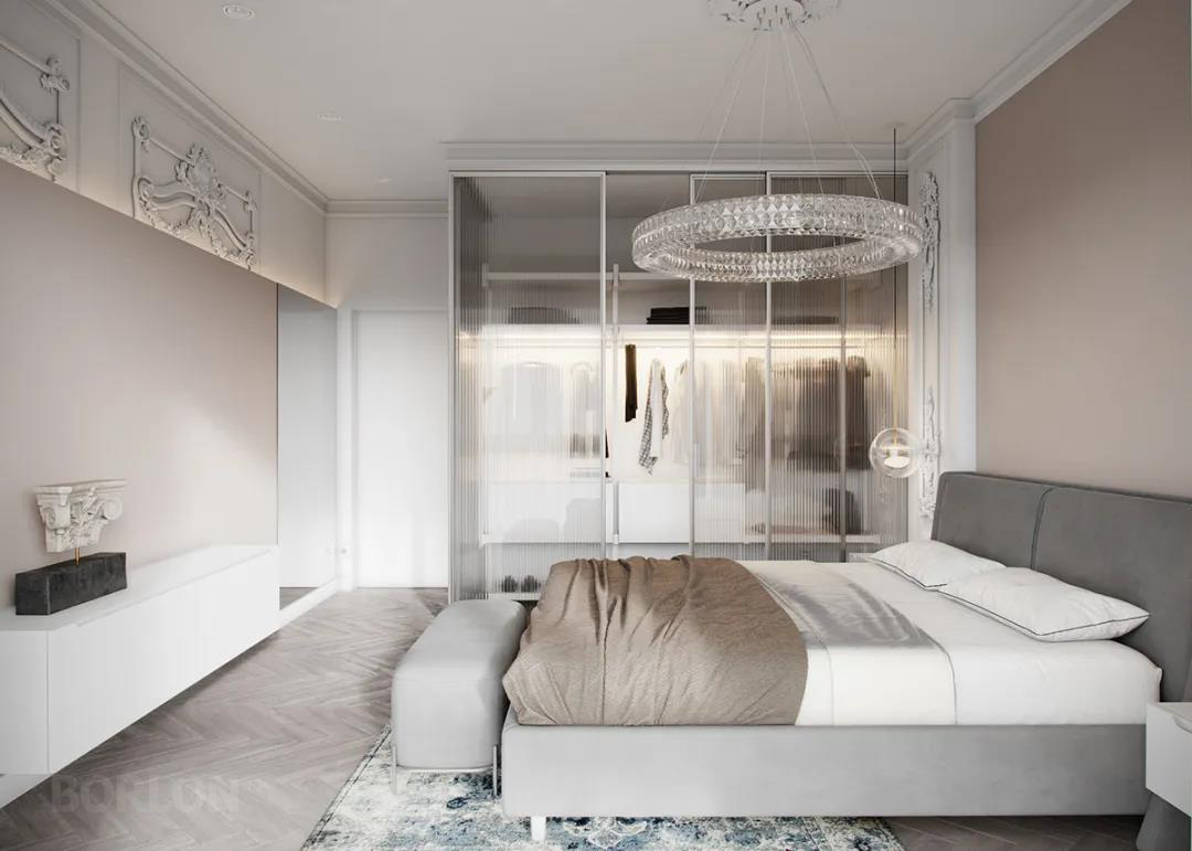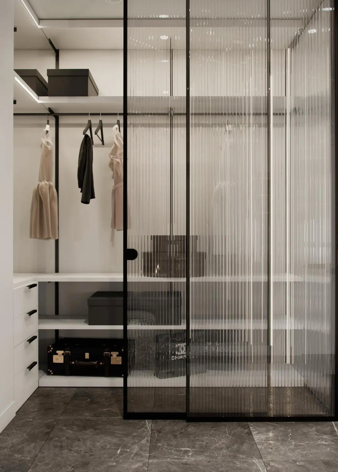 卧室之中,线条、色彩、材质的搭配,时尚却又不觉浮夸。玻璃门衣帽间与水晶吊灯的加持,平衡了轻盈与质感,调性极高,空灵静谧在室内弥漫,