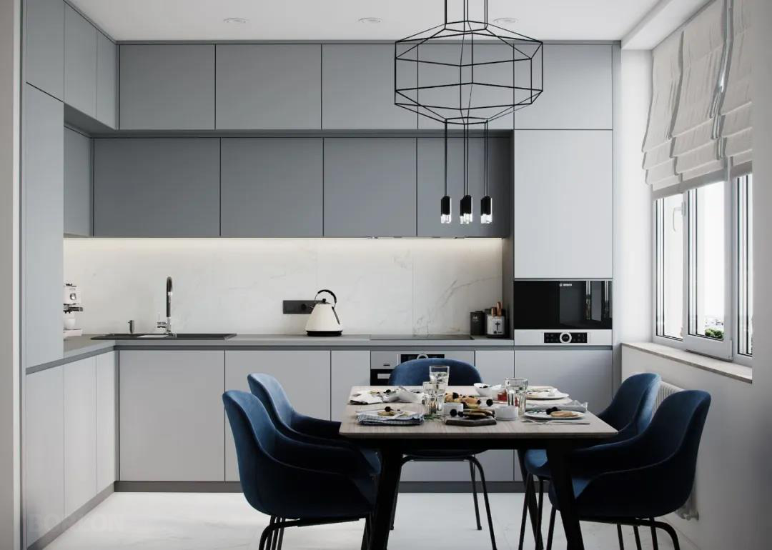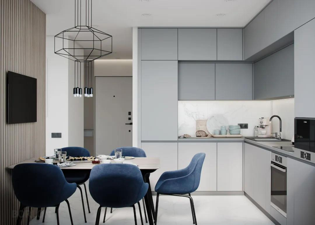 厨房简约而具有设计感,橱柜靠墙安装,除了容纳嵌入式电器,其他空间全部设计成收纳柜,通体的灰白色显得格外的整洁。