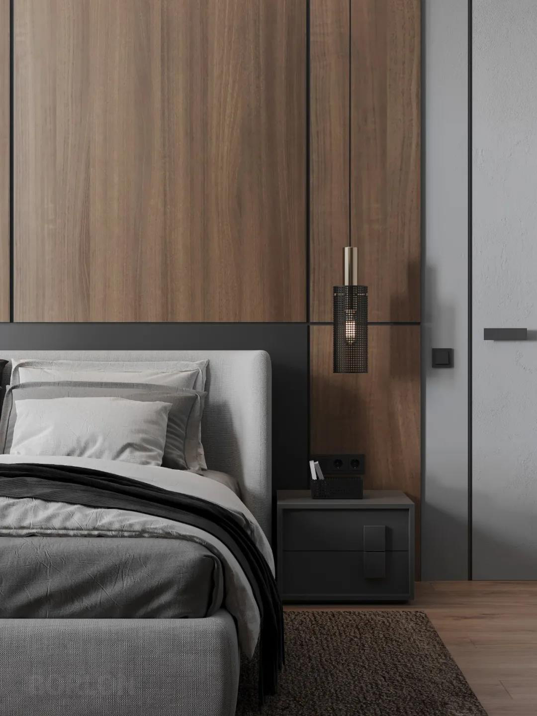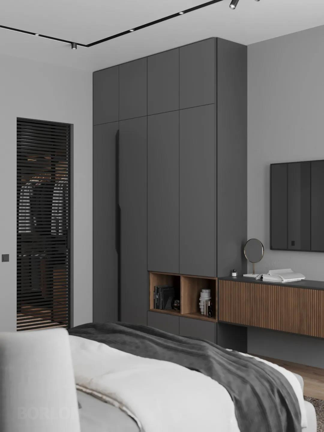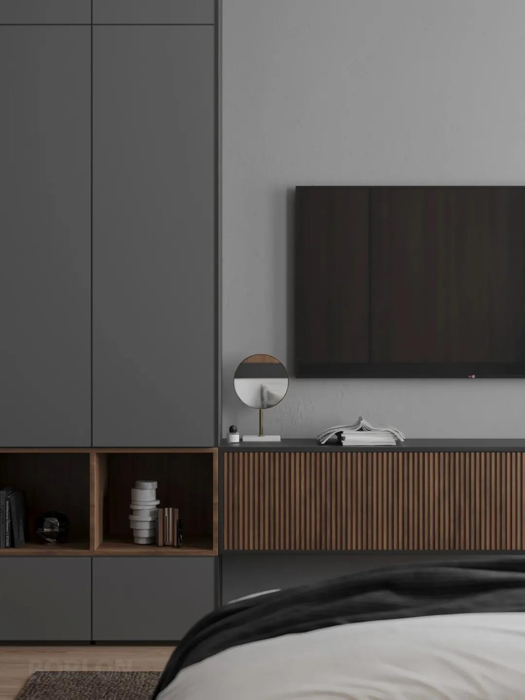 卧室的色调柔和,给人带来宁静,沉稳的气息。电视下面的柜子既是工作台又是化妆台,与房间角落的储物柜连接在一起,创造了一个连贯的空间, 使整个房间看起来极具层次感。