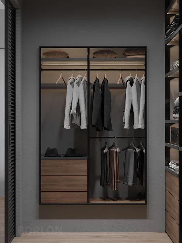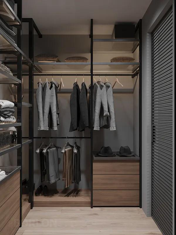 步入式的衣帽间空间不大,但开放式的设计存储功能依然强大,沉静的色彩,简约的款式,整个空间显得静谧深沉,给人一种干净整洁的视觉享受。