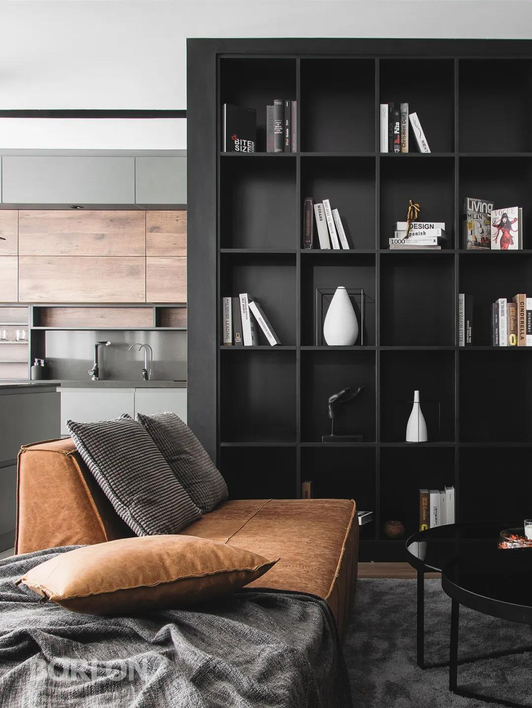 在有限的空间里,材质与色泽的选择非常重要。客餐厅一体化,中间以书柜墙半隔断开来,功能与气质上的需求又相结合。