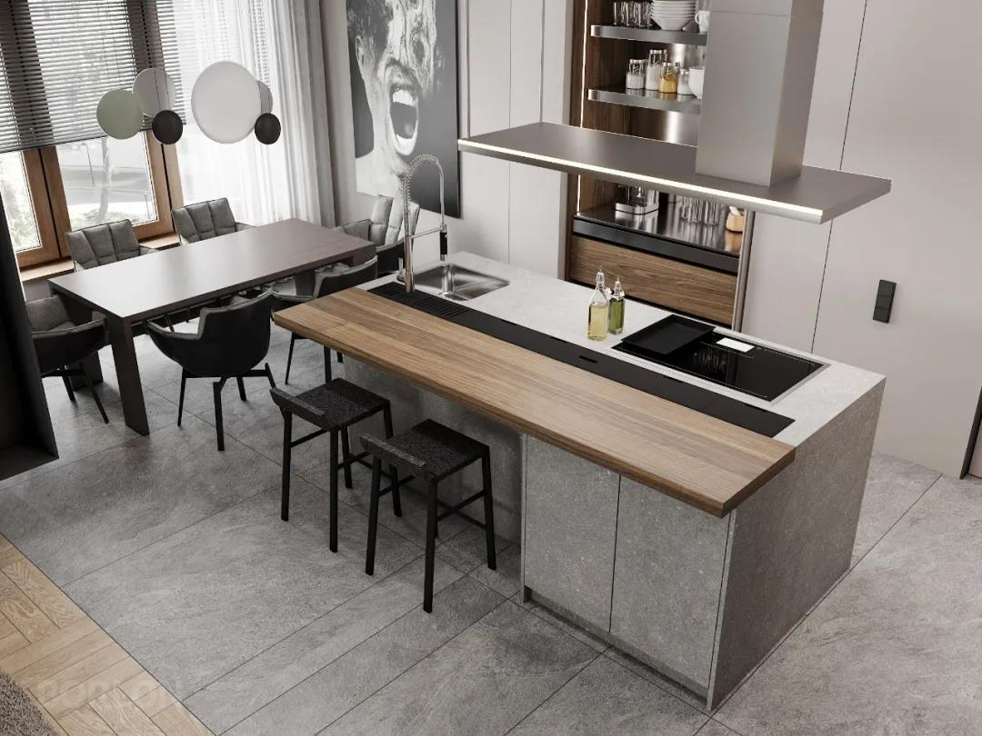 厨房的空间,温润的木材与石材的台面融合,美观性好,能给人一种温暖的感觉,而且触感也较为舒适。灯饰、软装的搭配,勾出一种自然舒适的美感。