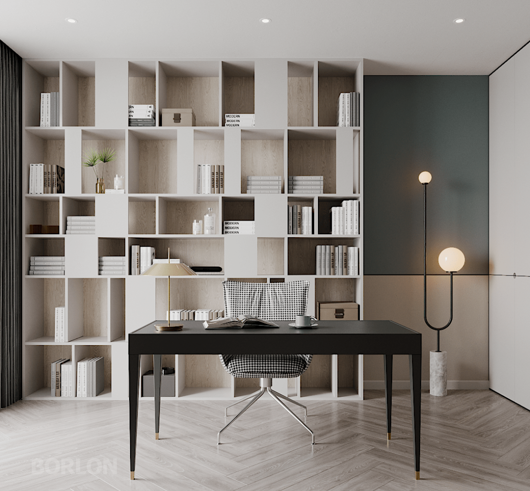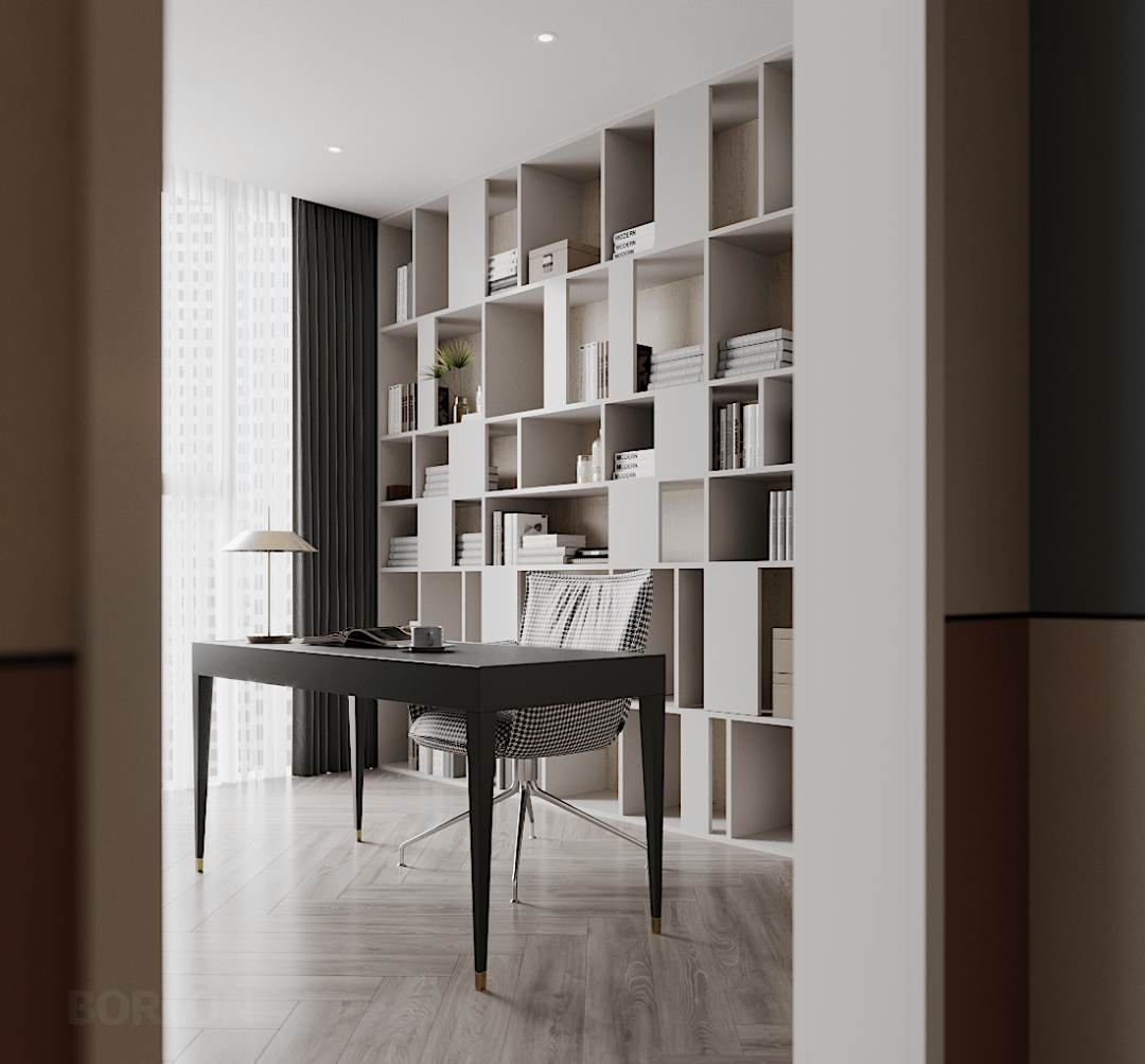 临窗而设的书房空间,白天阳光透过窗铺洒在桌案之上,夜晚星光月色又各自登场。
