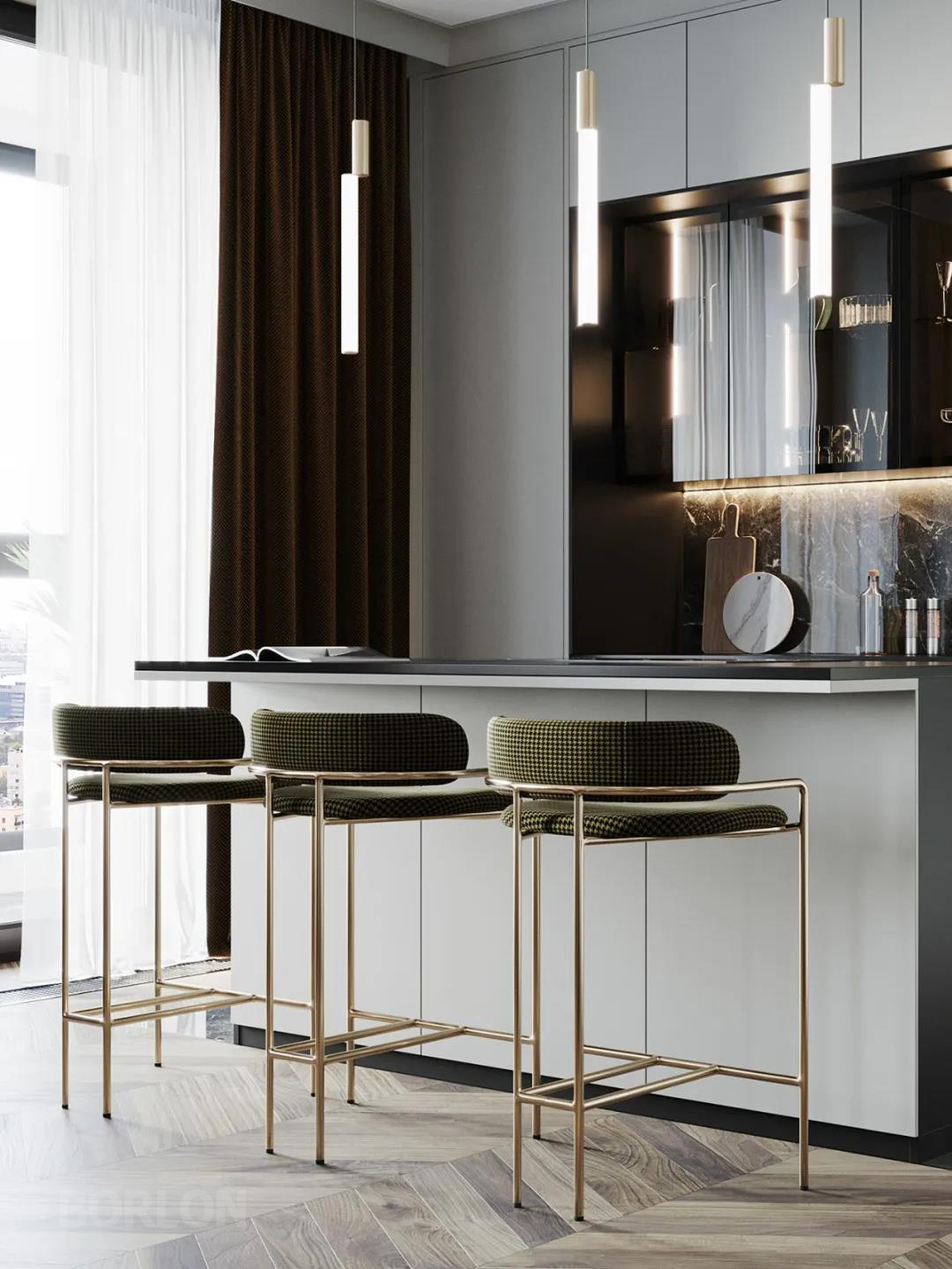 金属材质的运用,使整个厨房空间都散发着简约的现代感,翡翠绿的餐椅又给空间注入了活力,也体现着居住者的独特品味。