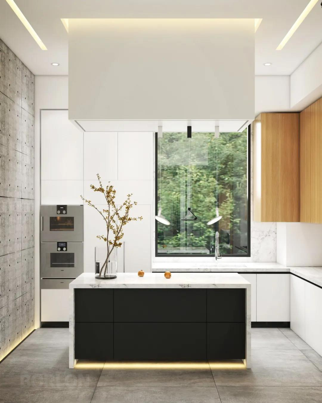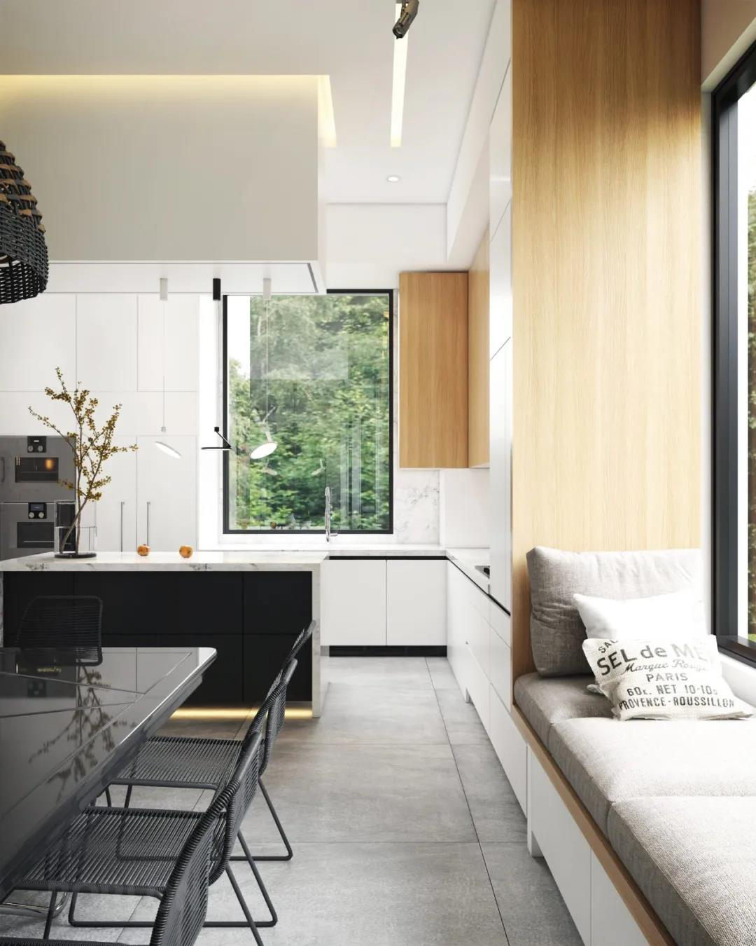 素净简约的空间里,深与浅的交织,营造了一种平静的气氛,木色元素的加入,更让整个厨房流淌着时尚与典雅的气质。