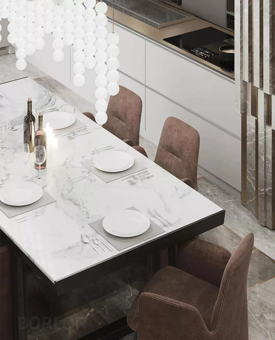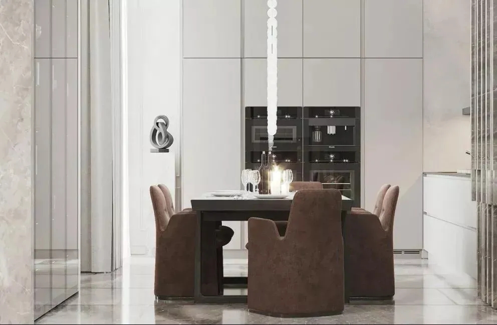 餐厨的设计以更简约的线条来融合空间,在视觉上给人一种奢华与优雅的感官体验,呈现出永恒的当代设计美学。