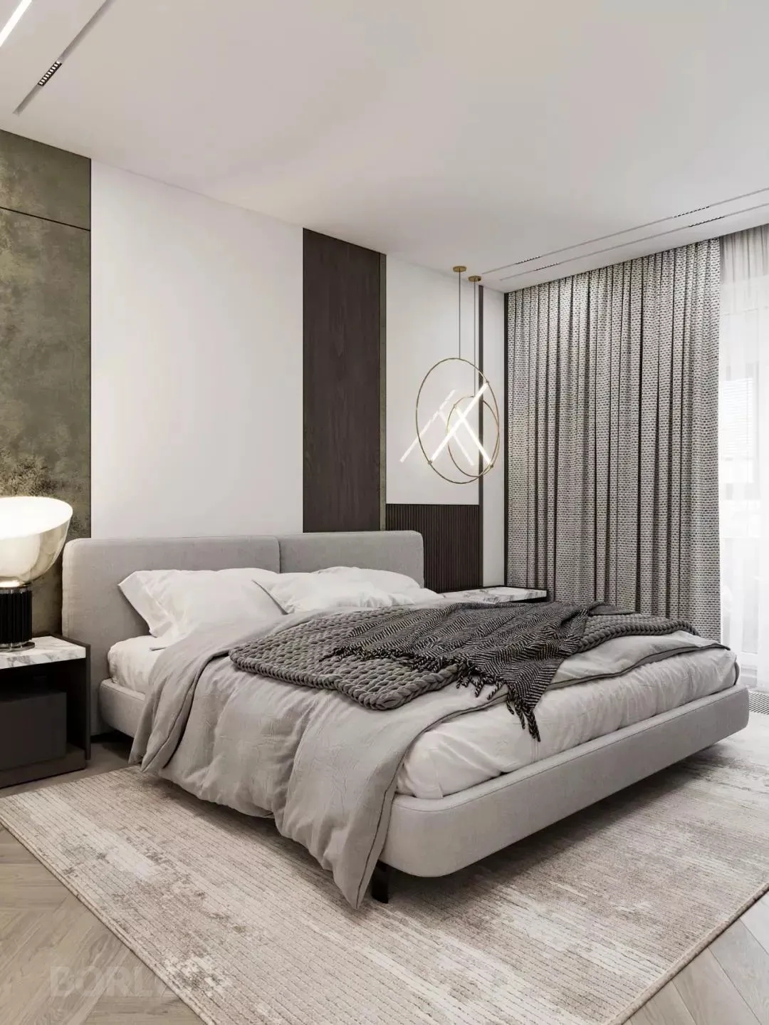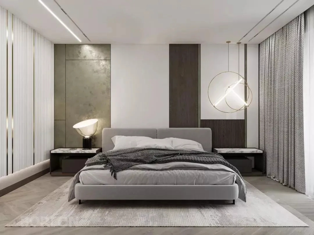 主卧空间不多矫饰,以现代主义的高度理性,减少陈设的构成元素,于现代极简主义中 流露出简约之美。