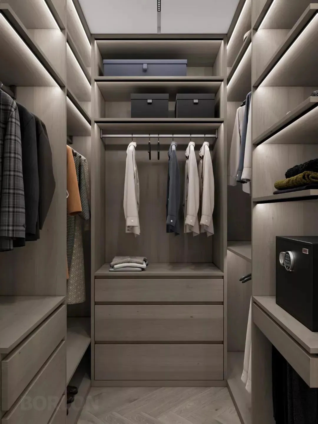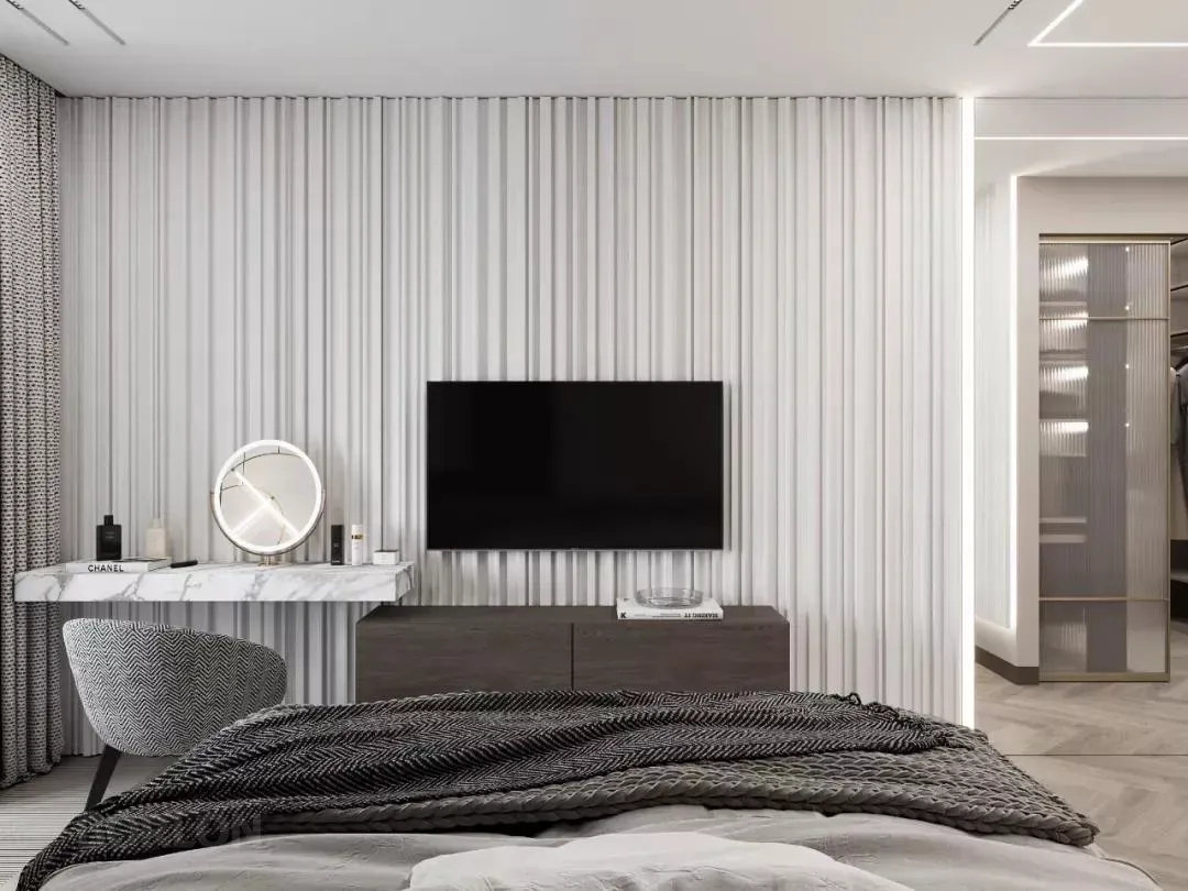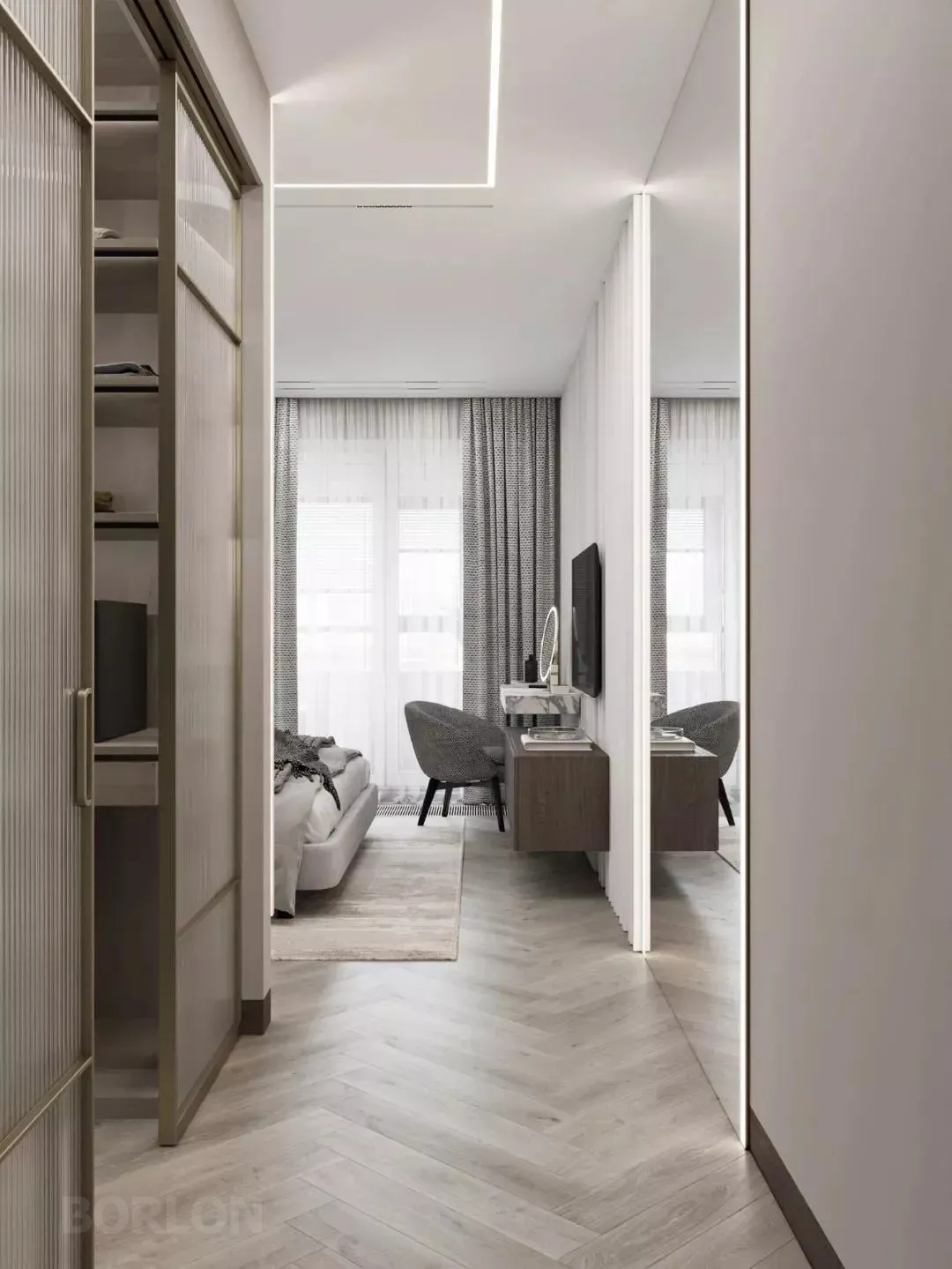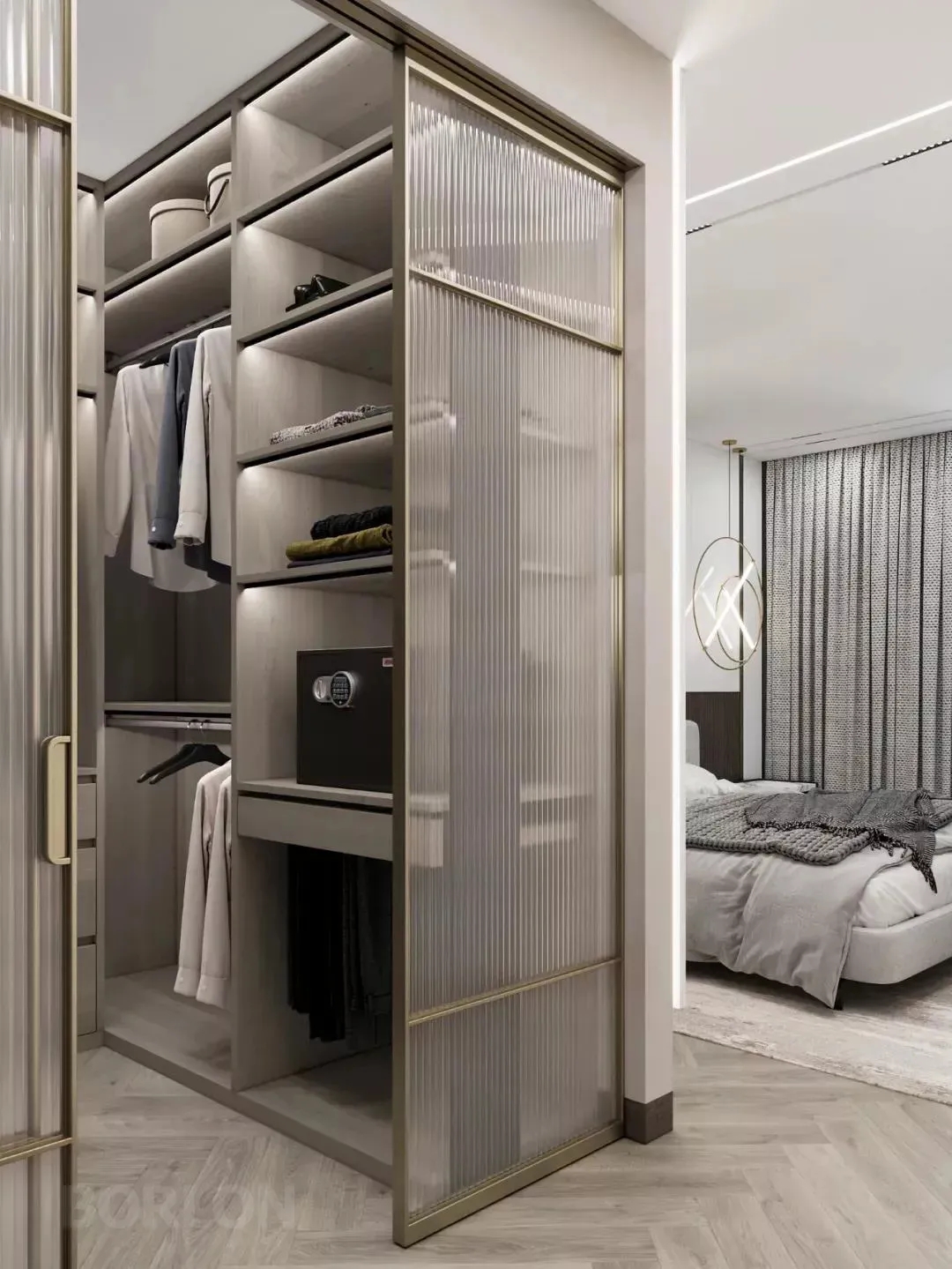 一侧的衣帽间不动声色中透露出低调的优雅,封闭与开放柜体结合,展示性与功能性兼并,在变化的韵律中营造高冷格调和神秘气质。