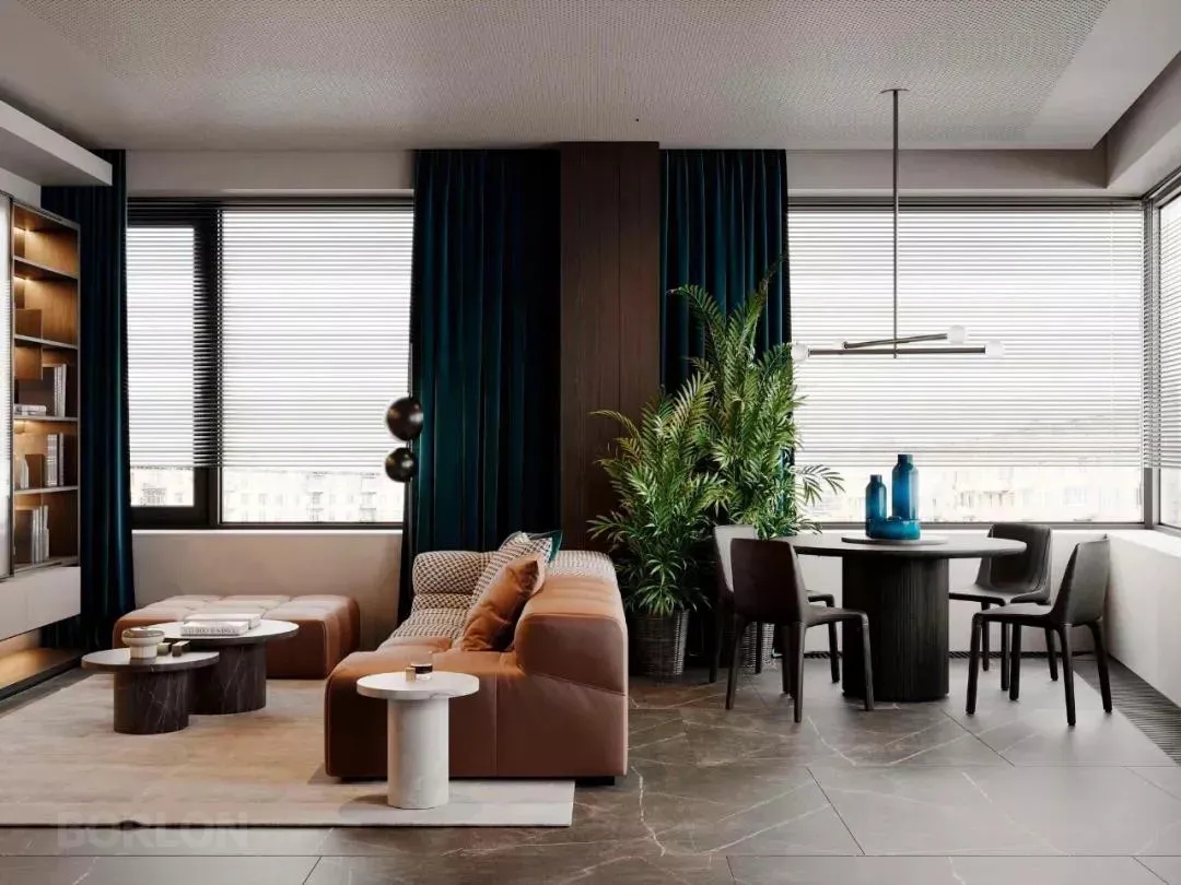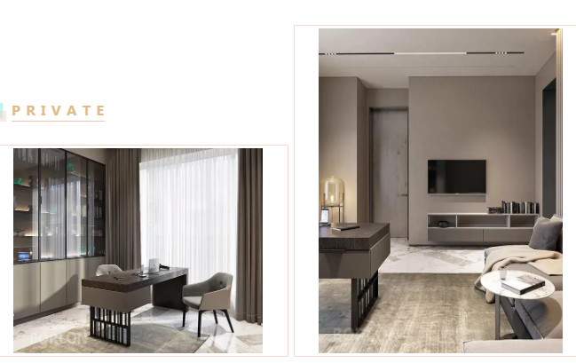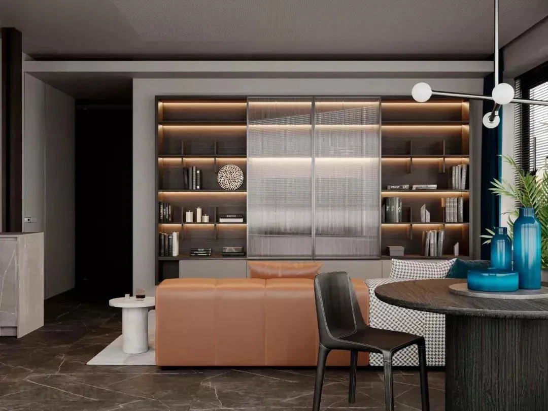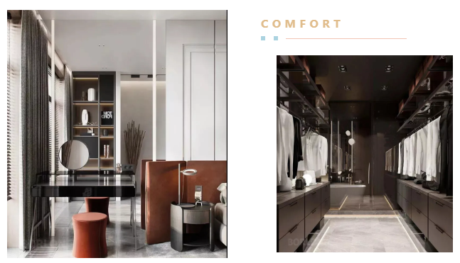 在软装的选择上,无论是储物柜、桌子、还是沙发都有其独特的美和作用,并融入轻奢元素,呈现出一种现代舒适而又华丽优雅的从容气质。