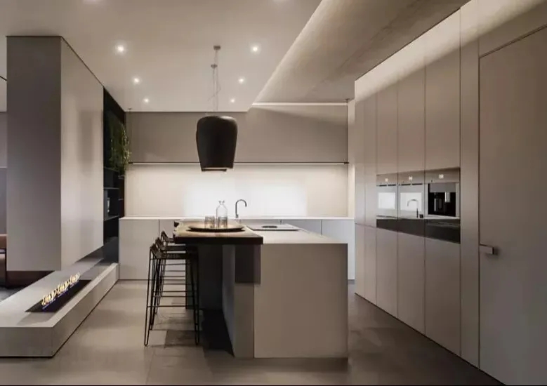 开放式厨房,色调中性柔和,岛台加高柜,内嵌式厨房家电的配置,让整个厨房的功能得到了满足。
