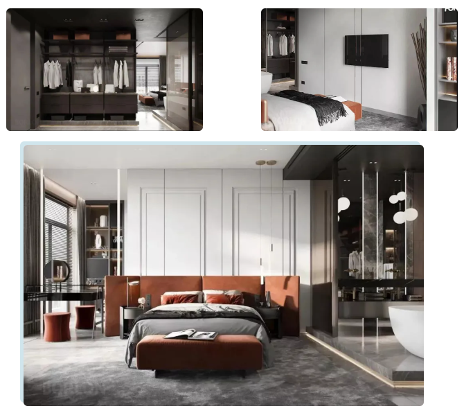 现代舒适的卧室,床头墙以白石膏板为背景,橘色的注入,打破了空间原有的冷硬气质,营造出了一个高级又轻奢的卧室空间。