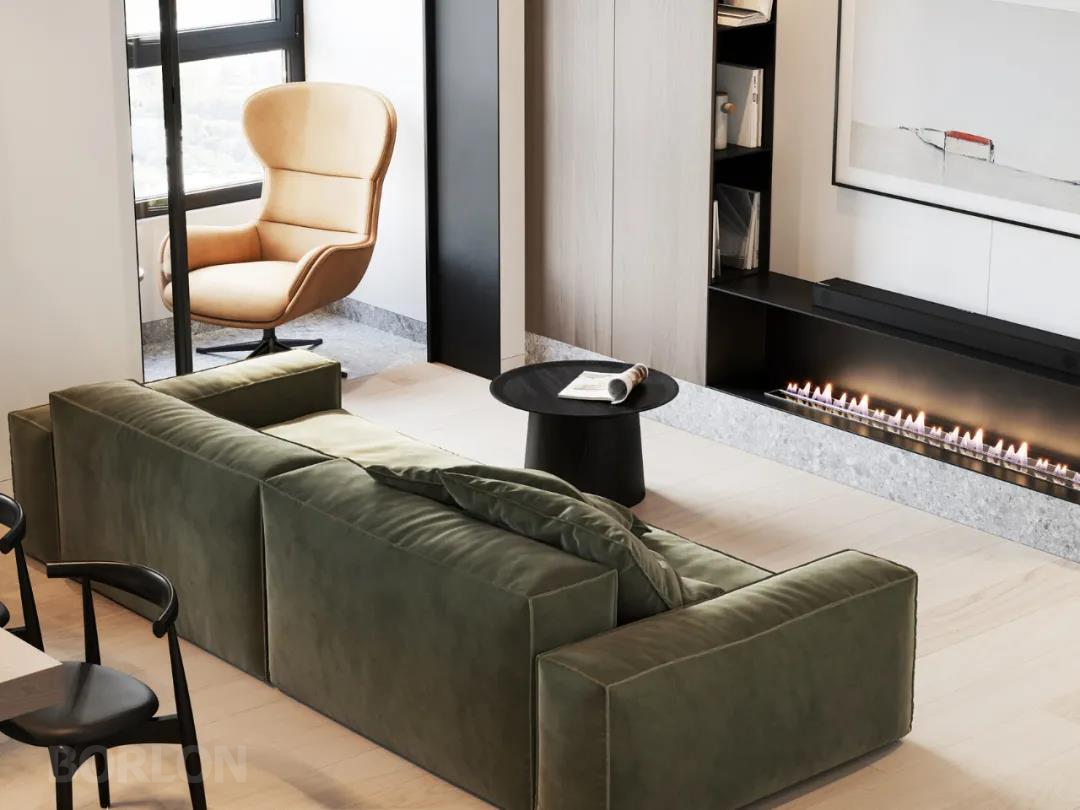 深绿色的布艺沙发,白色的柜子,皮质的阳台座椅,各种材质与光线、空间的自由组合,带来了丰富的视觉效果。
