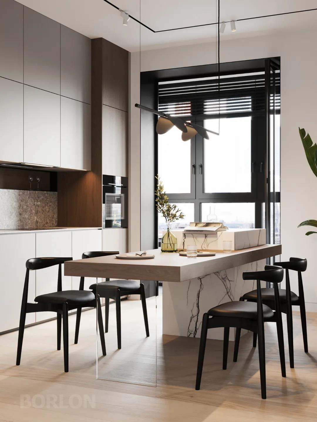 餐桌以岛台的形式呈现,白色大理石与木色相结合,搭配造型简洁的黑色灯饰,带着自然的气息,营造了一个简单舒适的用餐环境。