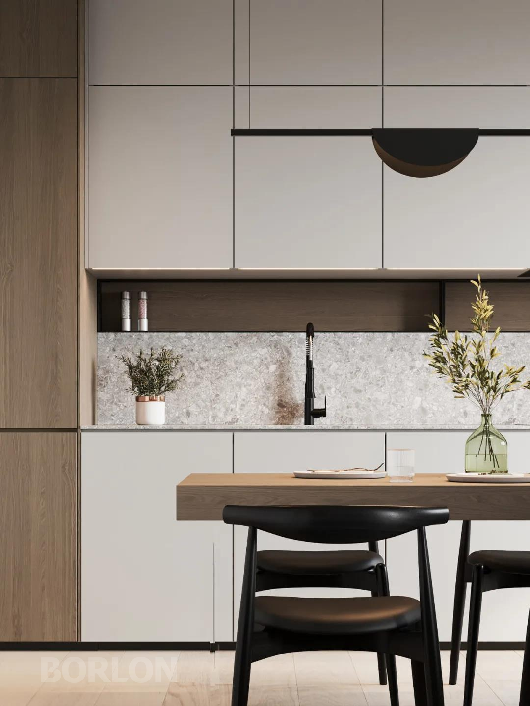厨房与客厅之间以餐桌和岛台作为间隔,橱柜靠墙安装,嵌入式电器与收纳柜的组合,简约而富有设计感。