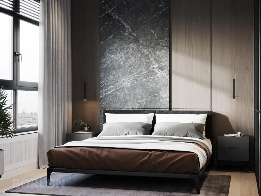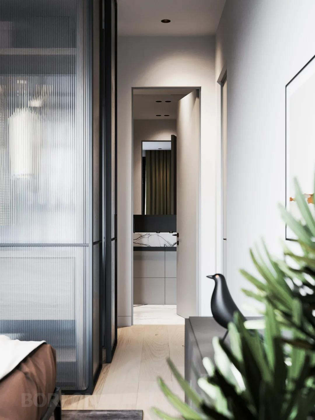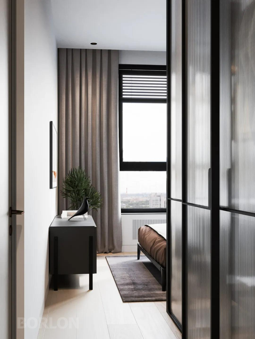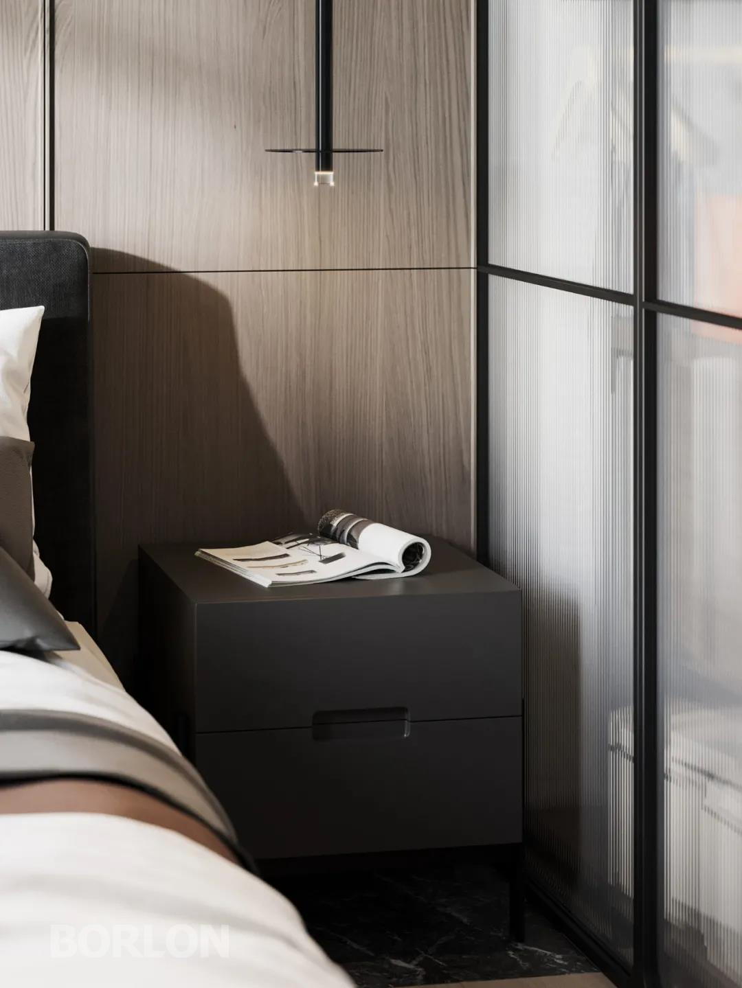 主卧色彩较深,延续了客厅的风格,一侧的长虹门板衣柜,半透明的质感,私密性与通透感兼具。