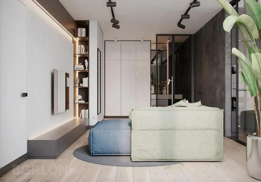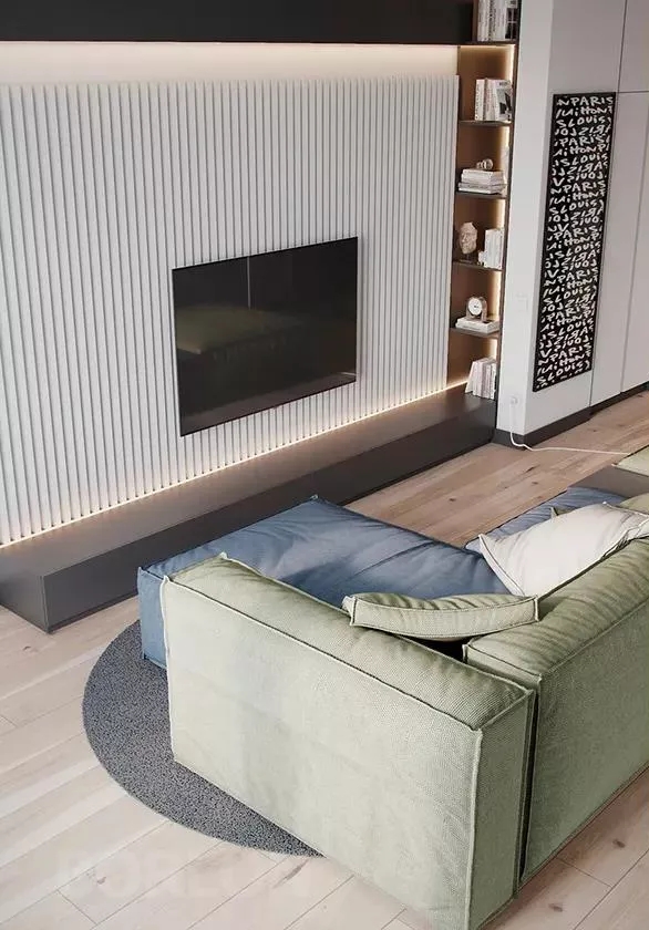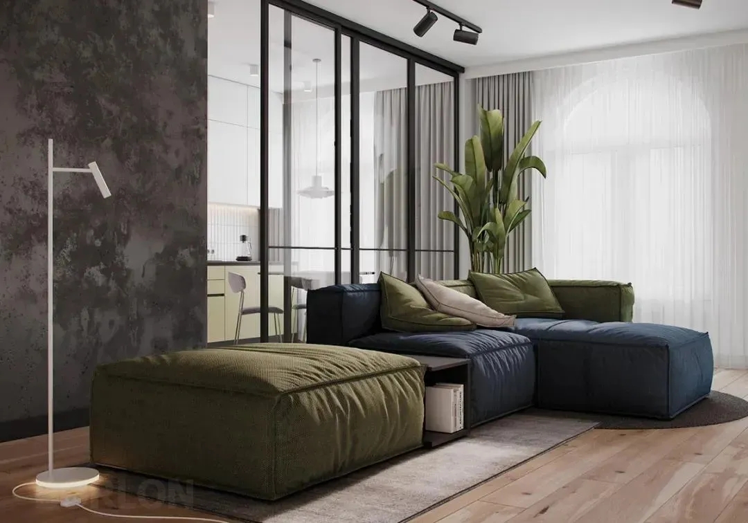 绿色与蓝色组合的沙发,灰色的地毯,