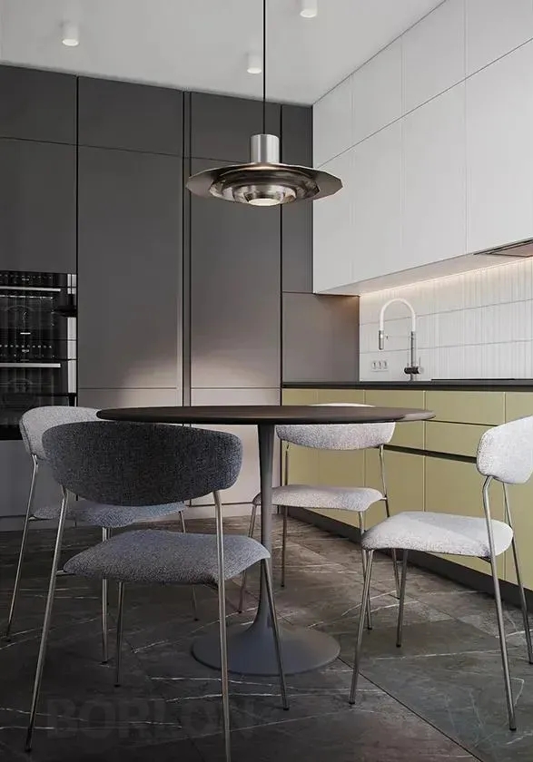 厨房区域以黑色、白色、绿色为主,