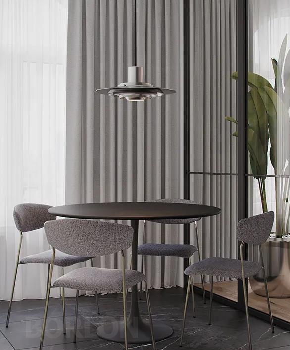 一张圆形的餐桌,几把椅子,一盏吊灯,