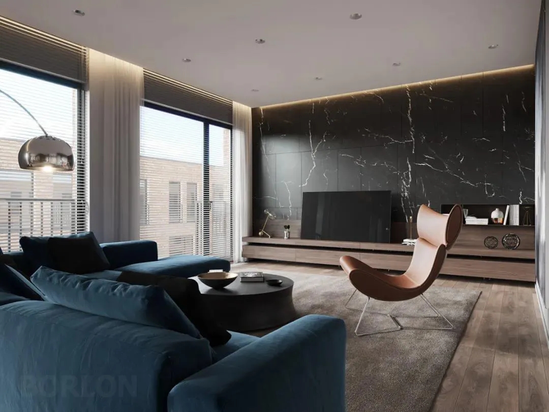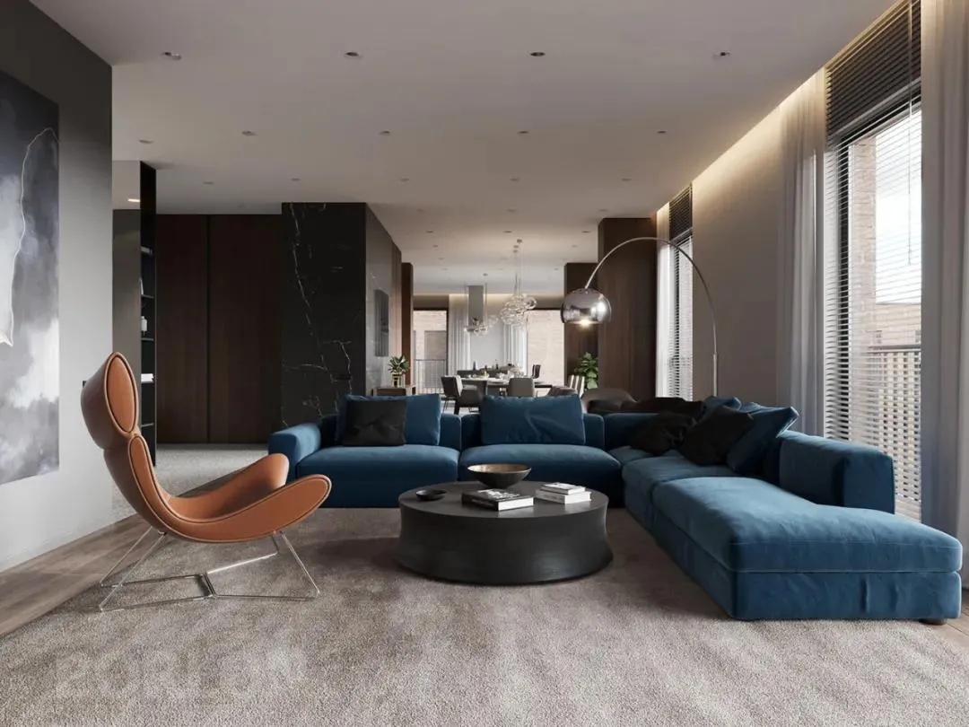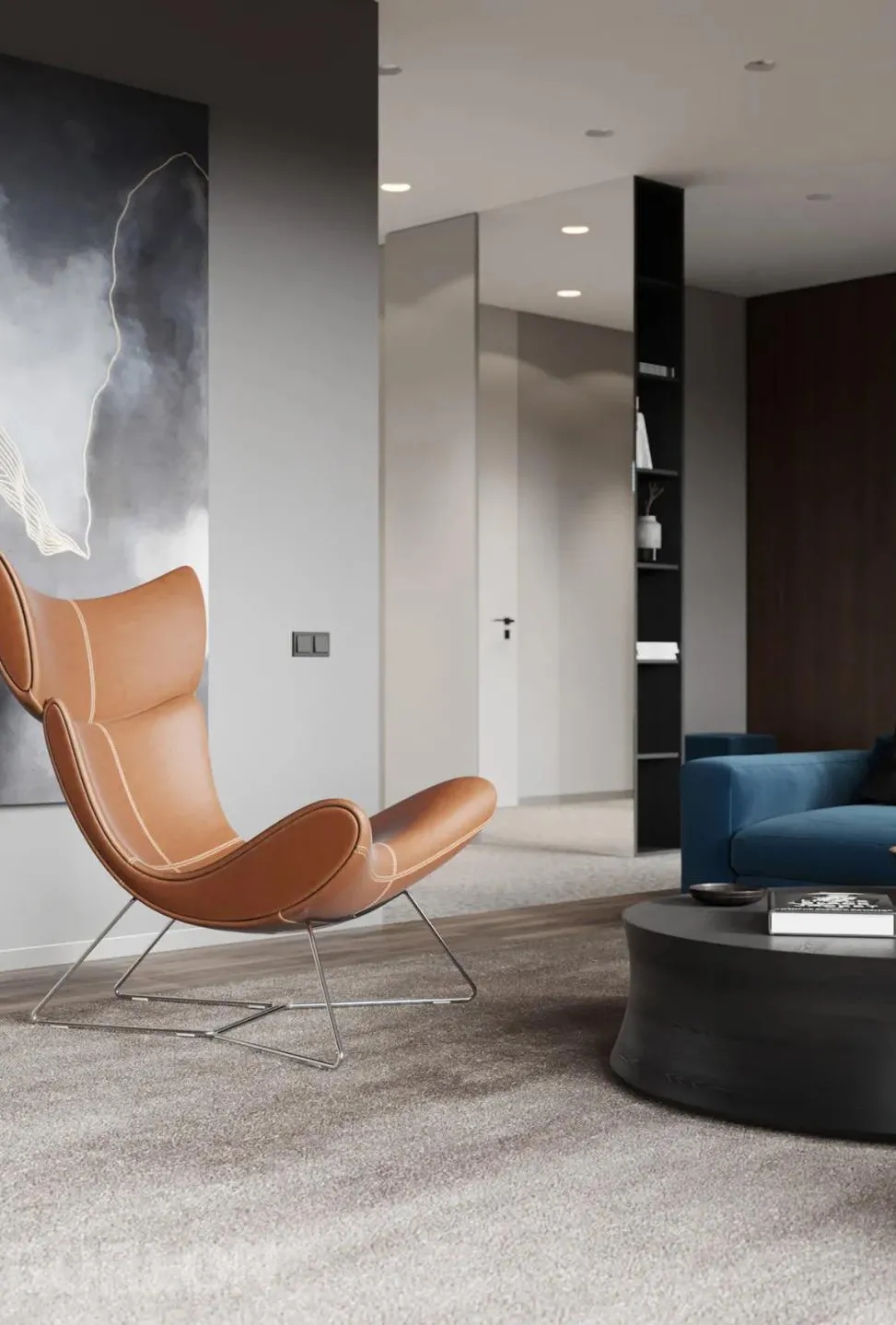 蓝色绒面沙发宽敞舒适,皮质的橙色躺椅被温柔承托,让原本简单的客厅显得大气时尚。