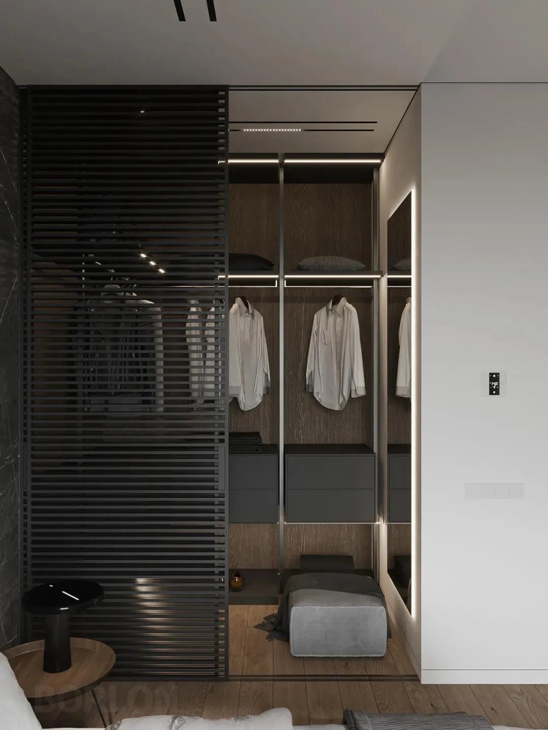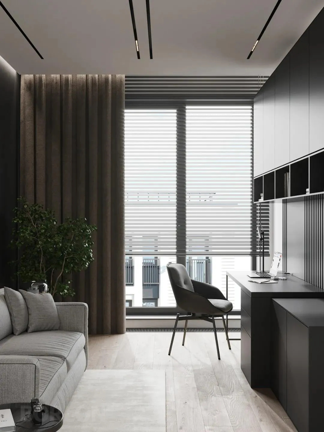 驼色窗帘凸显出主人的高端品味,空间以黑色为主,浅色为辅,完美呈现一种在视觉上永不过时的经典色。