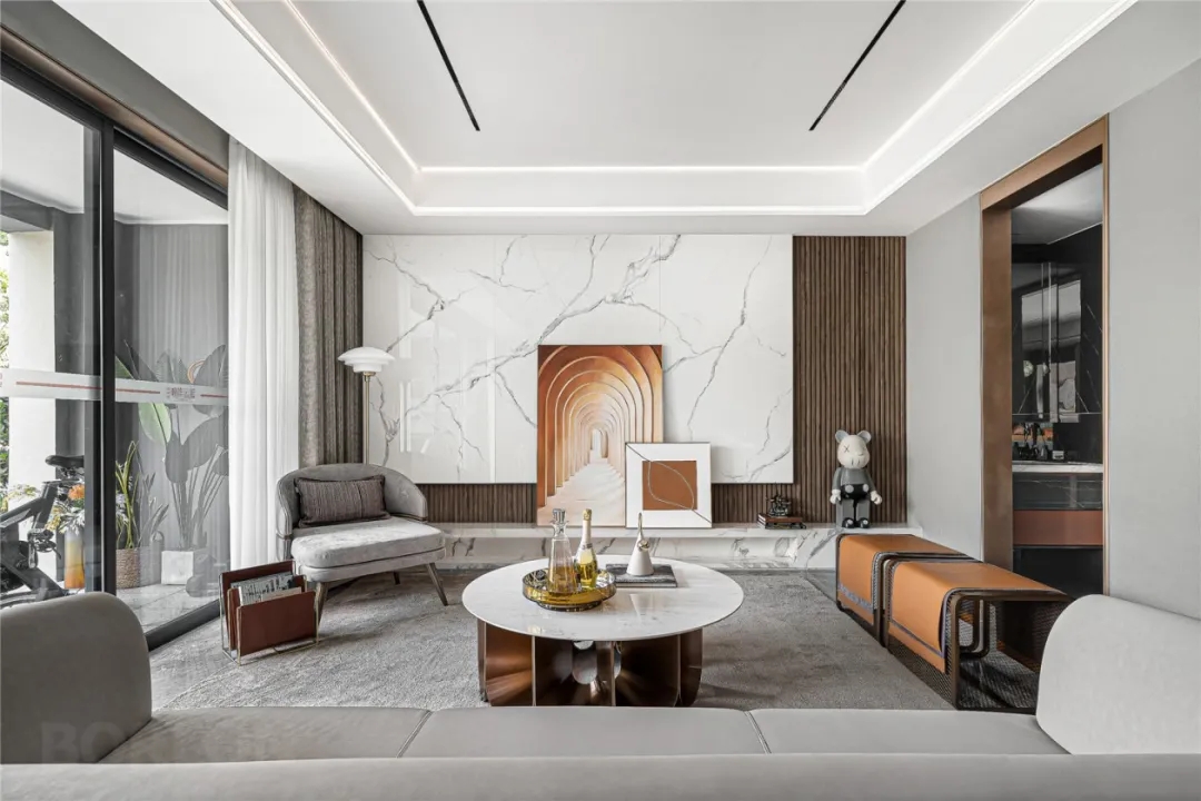 独有格调的岩板背景墙,制造出整个客厅的视觉焦点,与艺术画一同构成别致端景,轻松让你的居家环境焕然一新。