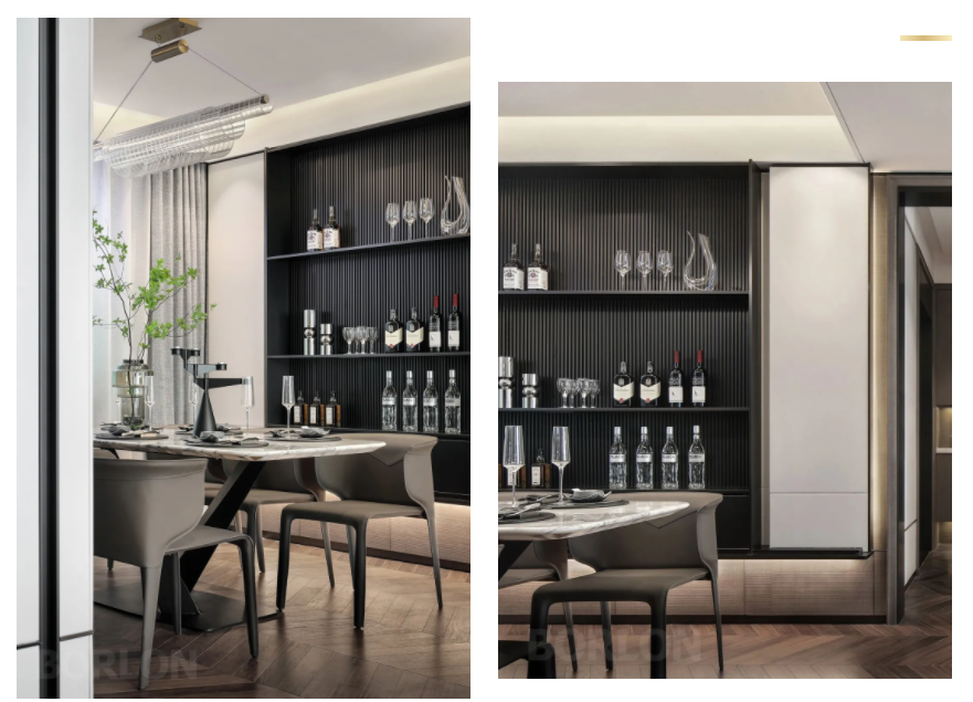 内嵌于墙的烟熏欧橡长虹板酒柜塑造了完美的空间立体感,以最简单的方式浸润生活的浪漫自在,与家人在一起共享三餐,