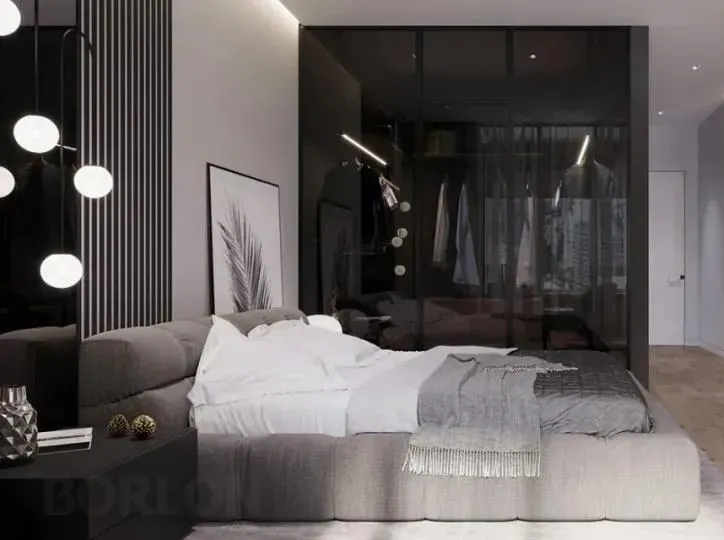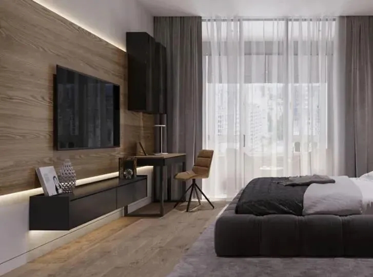 木色系优雅温润,与灰色床品相衬,两侧床头灯光交汇下,平衡了空间的色彩,又提升了居所的品味与内涵。