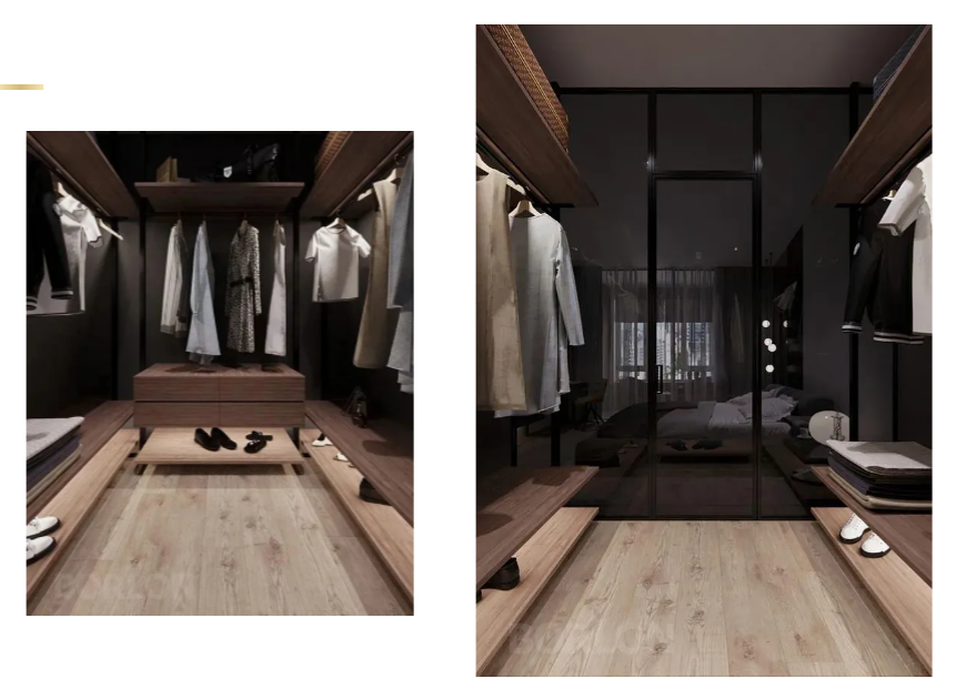 行走于拥有高颜值摩登范的衣帽间,静谧的木饰纹理游走在柜体上,时尚的灯光元素充满情调,不由得感叹由内而外的高端设计理念。