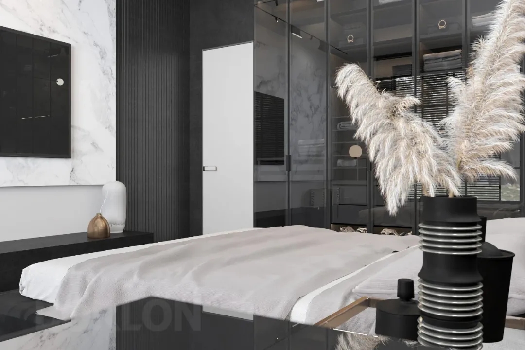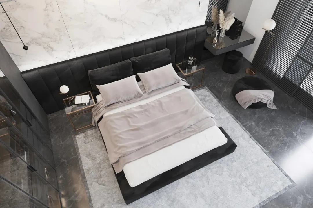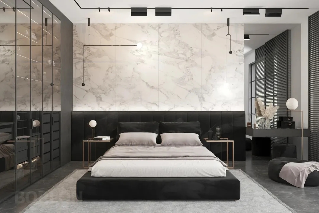 白色的大理石添佐纹理,让简单色彩组合呈现高雅质感,让卧室成为喧嚣城市中的一隅静港。
