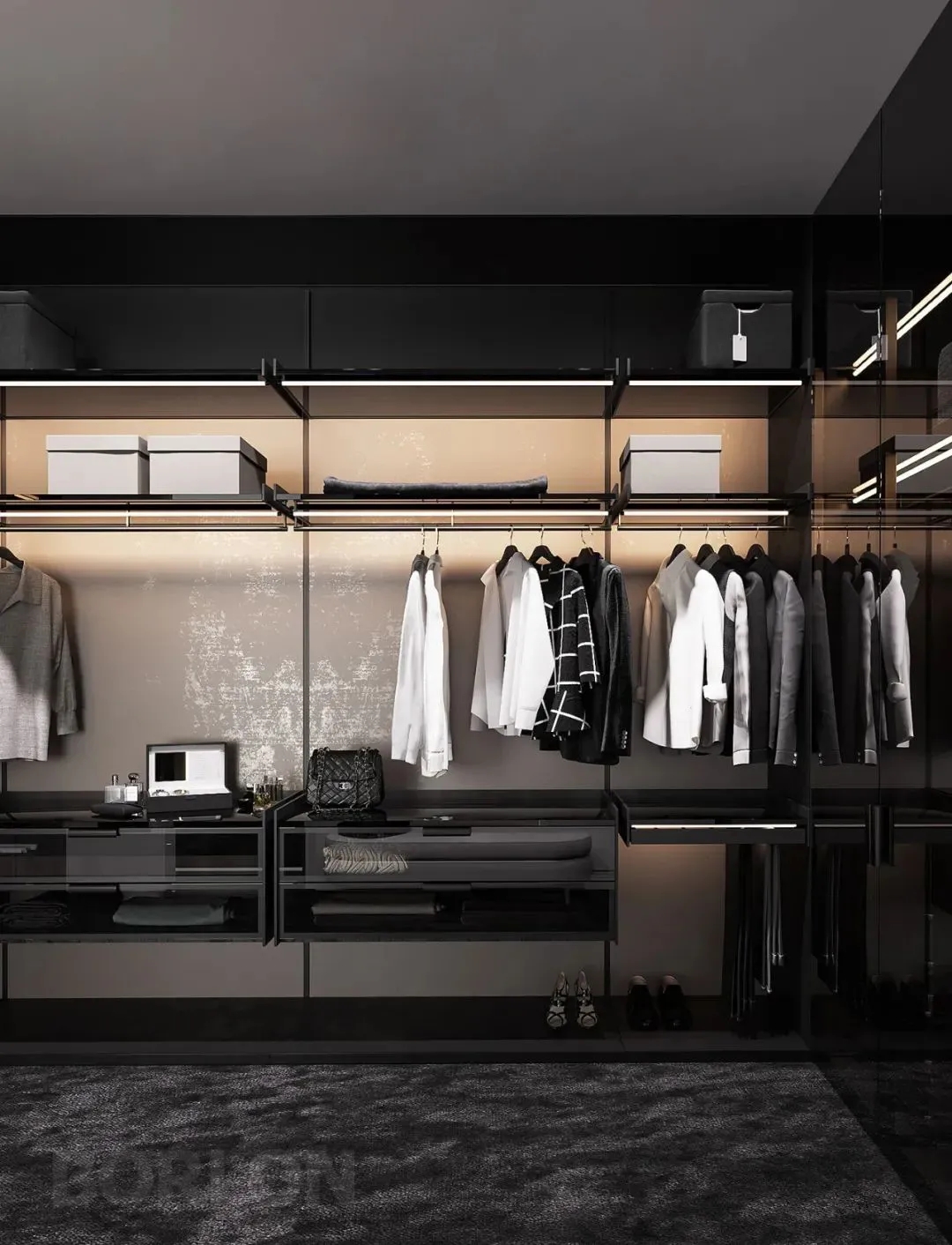 通明玻璃衣柜质感轻盈,极尽视野,让衣物的收纳从眼花缭乱变得一目了然。