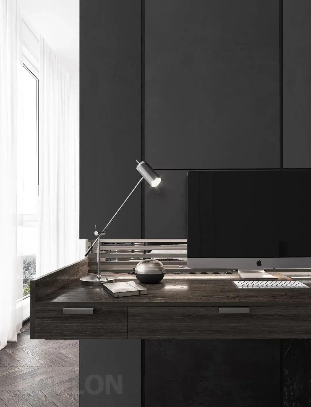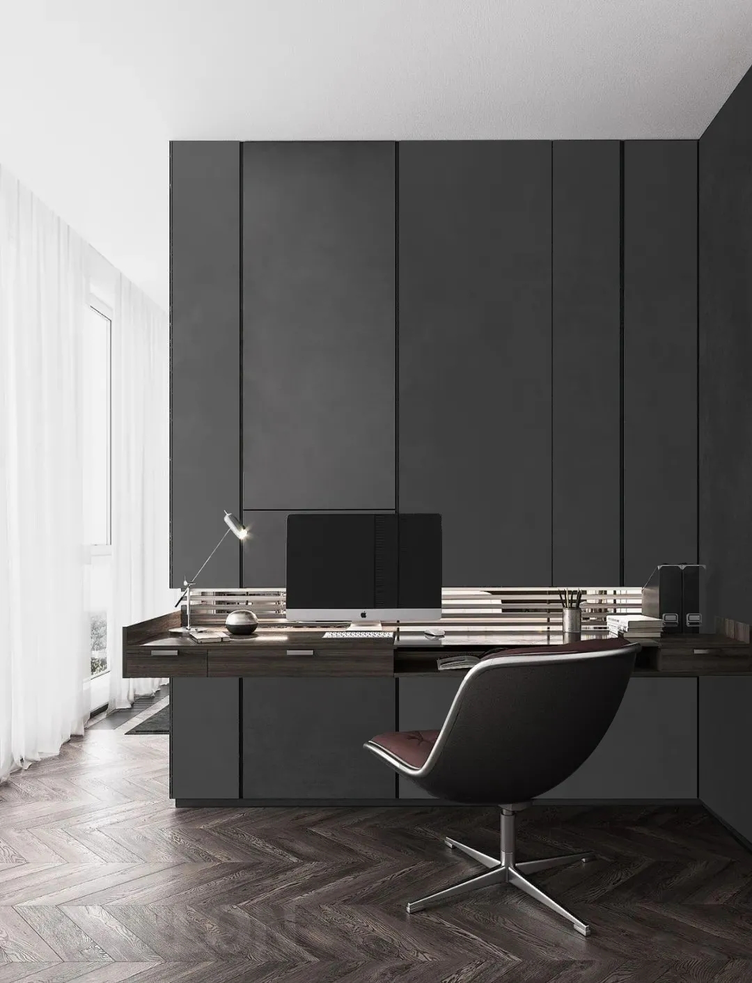 书房让工作空间充满精致,简洁的布局 中不缺实用的功能。静谧的黑在神秘中穿 梭,在理性中发挥,隔绝无畏的干扰。