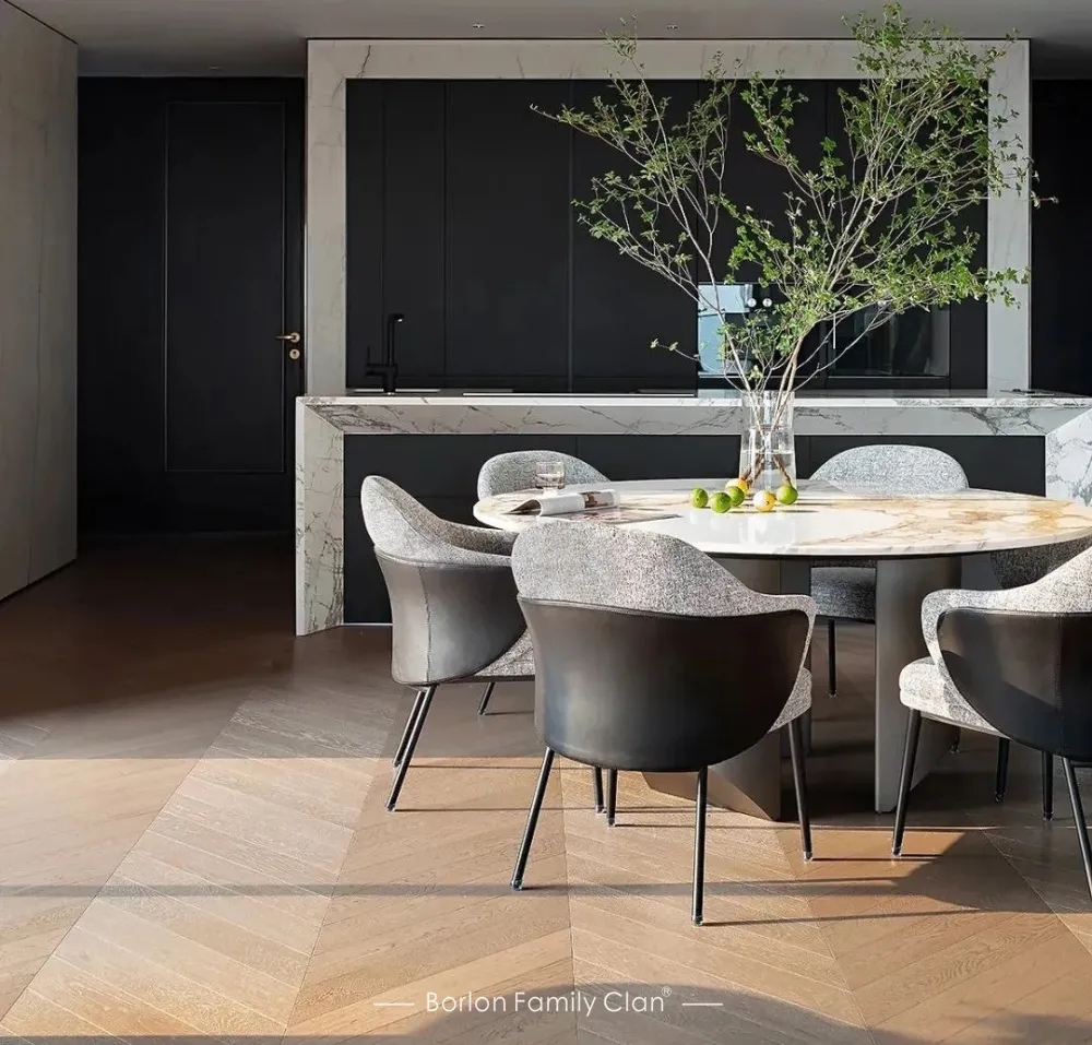 目光所及之处,是专属橡木的奏鸣,良好的恒温性、降噪性,与似离而合的的光条极佳的装饰建筑墙面。