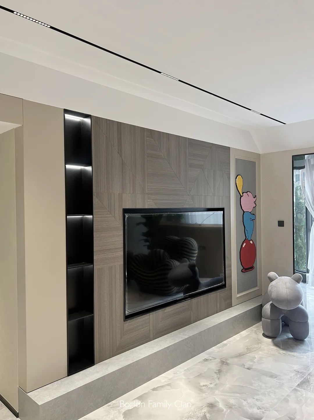 内嵌入电视立于墙面中心,