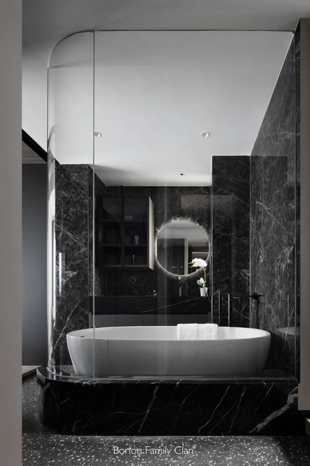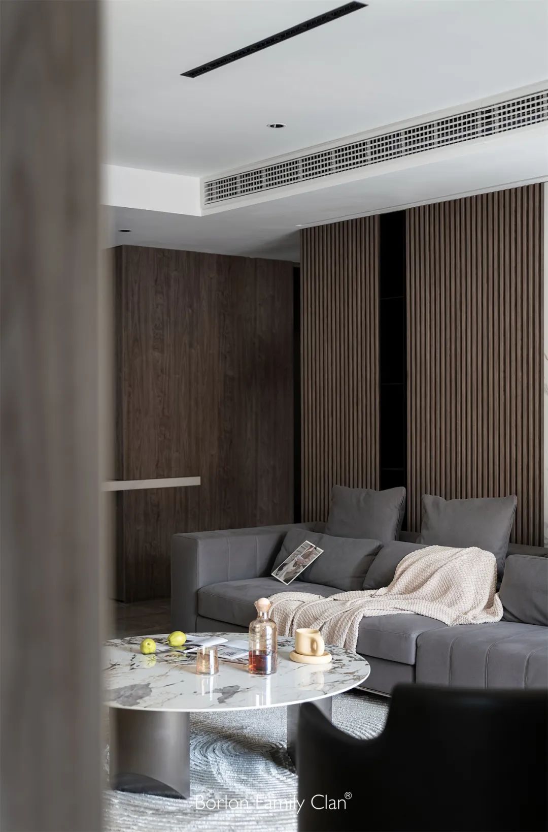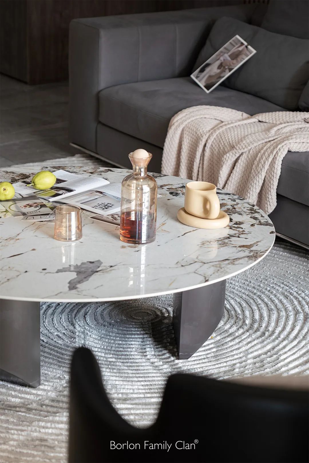 深灰充满高级感的沙发搭配曼妙肌理的石材茶几,