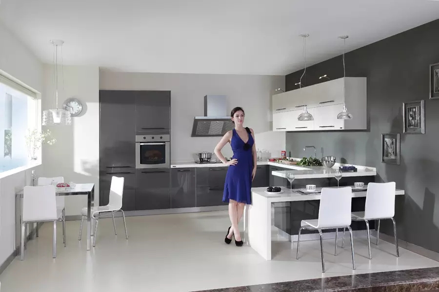 在技术上,这款橱柜利用了欧洲最先进的汽车工业工艺技术设计理念,融现代烤漆工艺和简约造型艺术于一体,将科技神秘与时尚亮丽完美结合,是追求高品位生活人士的不二之选。整套产品采用了高贵宝马灰,冷静又神秘,为厨房营造出干净敞亮的氛围。产品的布局设计中巧妙运用了加高吊柜,突出层次感的同时,也满足了主人日常收纳的需求。配合简洁有条理的嵌入式家电,把生活趣味与人间美味都更好的囊括怀中。
