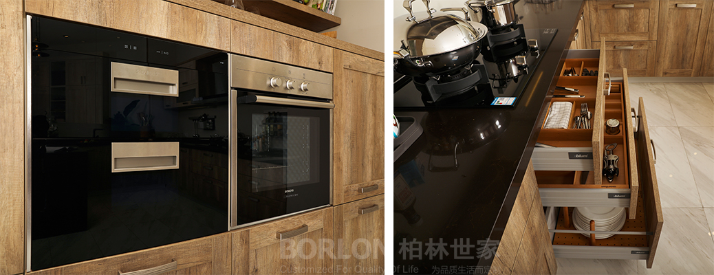 柏林世家结合对中国家庭的烹饪动线研究,打造科学的收纳空间。使用BLUM开关收纳柜,精巧的柜内分区系统,缓升开启的收纳柜将家用电器收纳保管起来,让你彻底告别乱糟糟的厨房时代。实木料理桌一物两用,既能料理食材同时兼顾强大的收纳功能,除此之外还能邀约三五知己共享下午茶时光,让你的厨房不单是料理烹饪的地方。