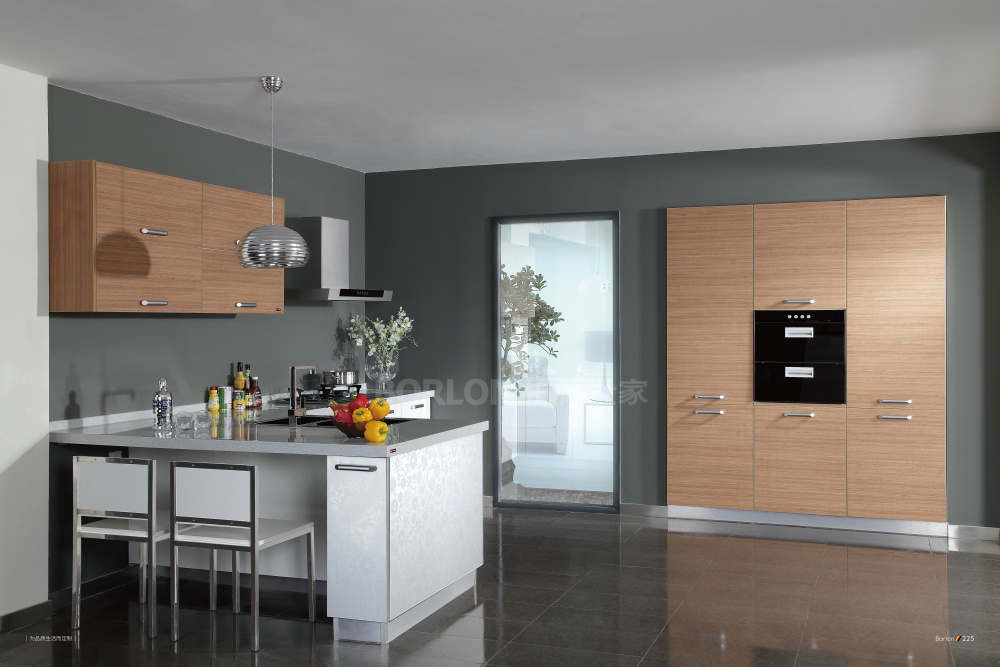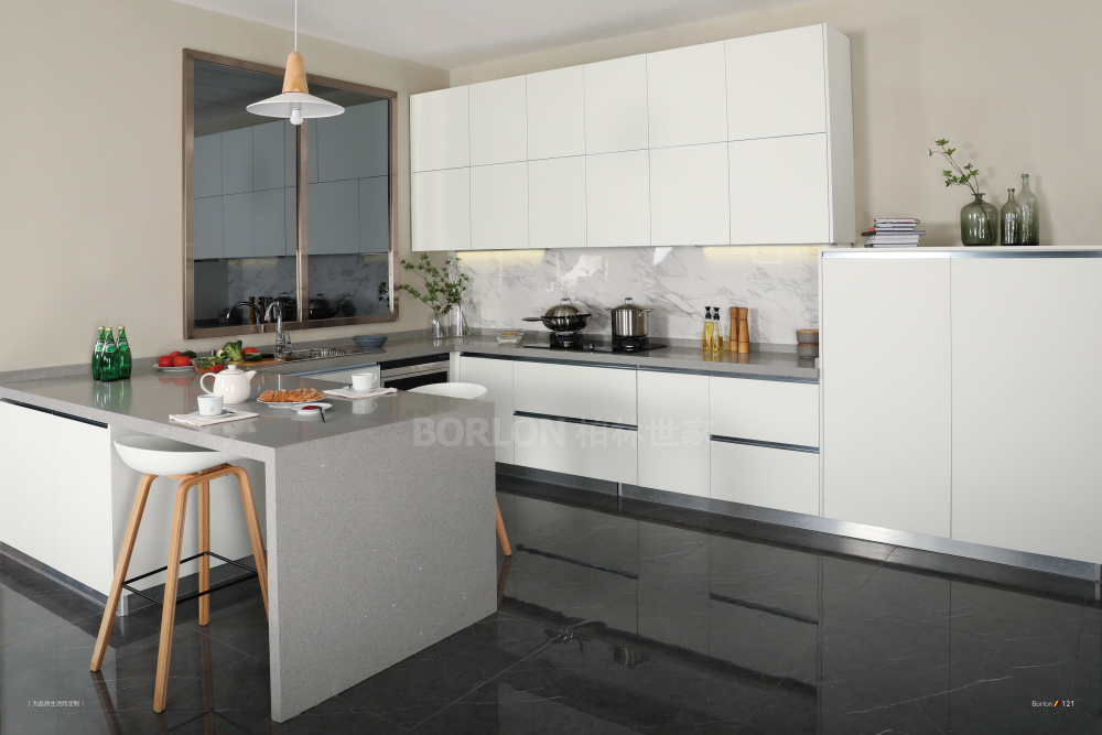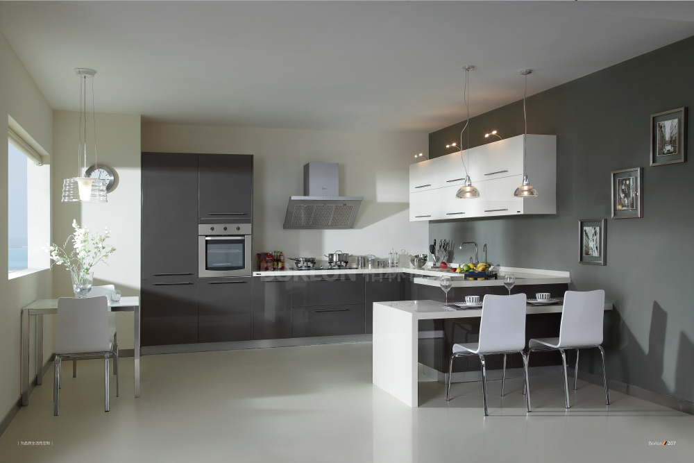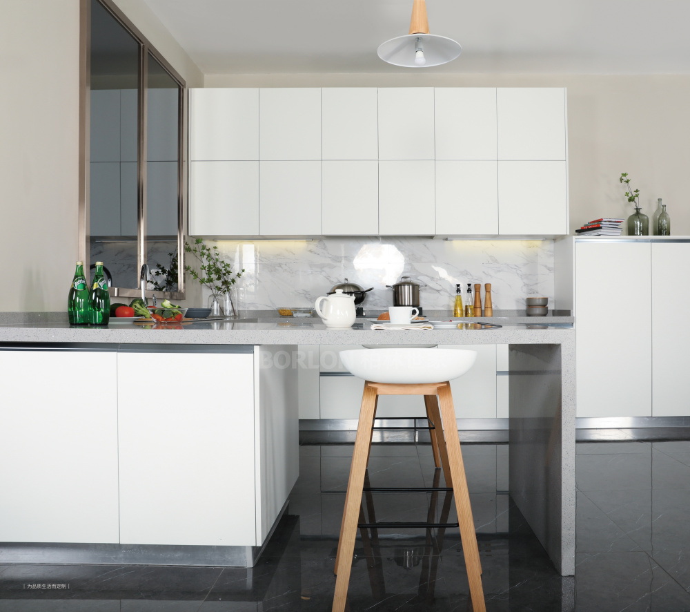 橱柜材质的选择,瓷砖不锈钢都是不错的,价格上嘛瓷砖的造价会更便宜些。台面的话不锈钢就略微不适,因为它怕划。台面相对来说,石英石算是不错的。台面挡水条也是需要的,能做一圈当然是更好了。厨房的门用玻璃推拉门是最好的,这样在视觉上厨房也会更大一点。